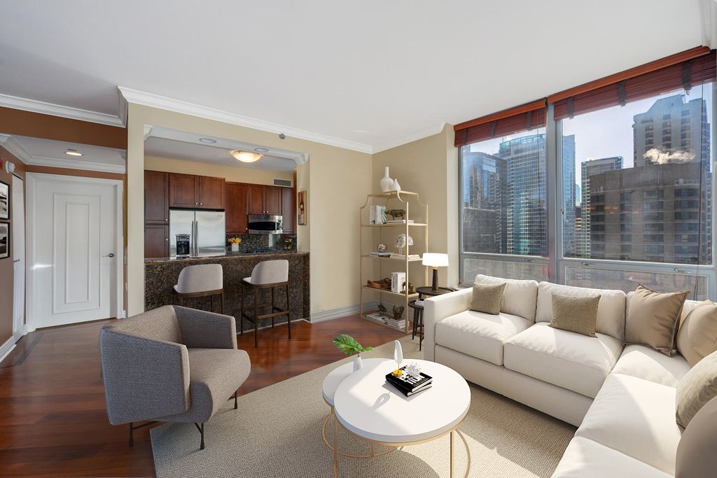 Come tour this high-floor two-bed, two-bath corner unit located in the heart of Streeterville. Upon entering, you'll be greeted by hardwood floors and a functional split floor plan. Enjoy the convenience of a private balcony where you can get fresh air and take in the city views. Benefit from a seamless flow for entertaining, living, dining, and relaxing. The kitchen boasts granite counters, stainless steel appliances, and inviting bar seating. Utilize the versatility of the residence and add a table to create a dedicated dining space. Retreat to the spacious primary suite, featuring a walk-in closet that effortlessly accommodates your belongings. Ample storage space throughout (+ storage cage) helps provide a clutter-free living experience, while the unit's washer/dryer adds an extra layer of convenience. Indulge in the tranquility of the spa-like primary bath, complete with a walk-in shower, soaking tub, and double vanity. Cater to your needs with a second bedroom which can easily be a full-time bedroom or office. Two parking spaces are available for purchase for 35K/space along with unit. Live a life of luxury in this full amenity building, where your needs are catered to by five-star service and on-site management/maintenance. Enjoy peace of mind provided by the 24-hour door staff, take advantage of the on-site business center, and stay fit in the well-equipped fitness center or take your wheels out from the bike room and hit the lakefront path. Immerse yourself in breathtaking views from two rooftop terraces (+10th floor terrace), equipped with grills and fire pits, and community rooms perfect for hosting guests. Located just steps away from the lake, beach, parks, Navy Pier, renowned restaurants, entertainment venues, shopping, and Northwestern University, this perfectly positioned condo offers a truly unparalleled lifestyle. Schedule a showing now!