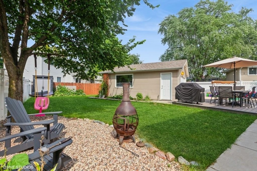Wonderful home featuring remodeled kitchen and 2 remodeled baths! Kitchen features 42 inch cabinets, glass tile backsplash, granite countertops stainless steel appliances. Many additional upgrades and updates include new Furnace/AC - 6/2024 Water Heater 50 gal - 5/2020 sidewalk around property -9/2020 Trex deck -6/2022 Also new patio door, basement and garage window - 6/2022 and new electric in oversized garage with 60 amp sub paned ready for electric car charging -6/2022 New chimney and vent flashing on roof - 11/2024 New firepit/seating area New Washer and dryer 2023 New vinyl maintenance free fence 5/2021. This home is truly ready for you to move right in! Walking distance to library,pool, rec center and grocery.