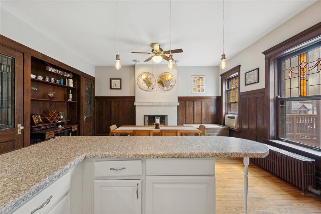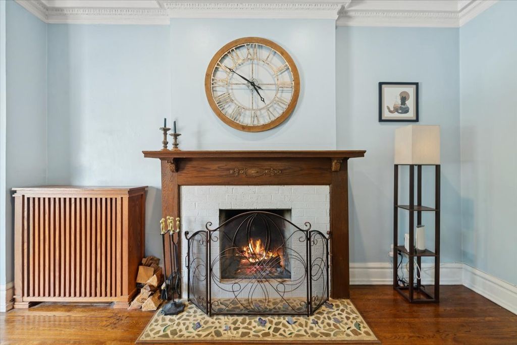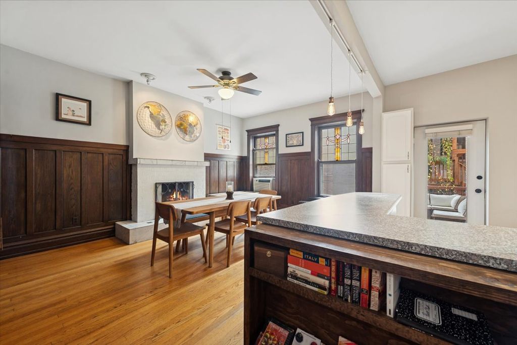 Discover this true East Lakeview vintage treasure, offering 2 bedrooms plus a den and 1.1 baths, perfectly blending classic charm with modern conveniences-including in-unit laundry. Step into a gracious foyer that opens to a spacious front living room adorned with rounded bay windows and a cozy wood-burning fireplace. Just off the living room, the sun-filled den makes an ideal home office or can easily serve as a third bedroom. The hallway leads to an open kitchen with stainless steel appliances complete with double oven that flows seamlessly into a generous dining room with built-in cabinetry and a second wood-burning fireplace-perfect for hosting and entertaining. Both bathrooms have been tastefully updated, and the large laundry area offers a stacked washer/dryer plus abundant storage. From the kitchen, step out to a private deck overlooking a serene shared courtyard, complete with tables, a grill, and a pond-your own urban retreat. Situated in a sought-after East Lakeview location, you're just steps from the Lakefront Path, Belmont Harbor, Broadway's vibrant dining and shopping scene, public transportation, and so much more.