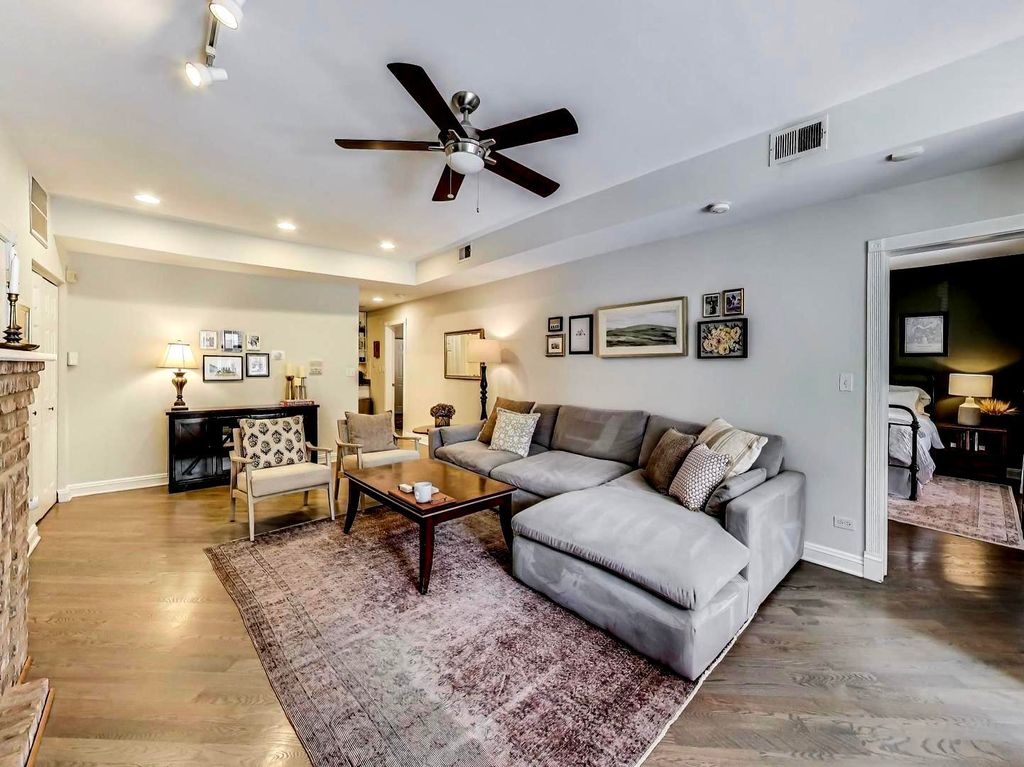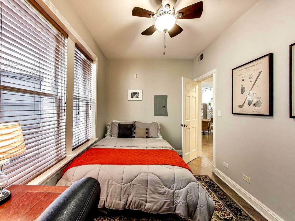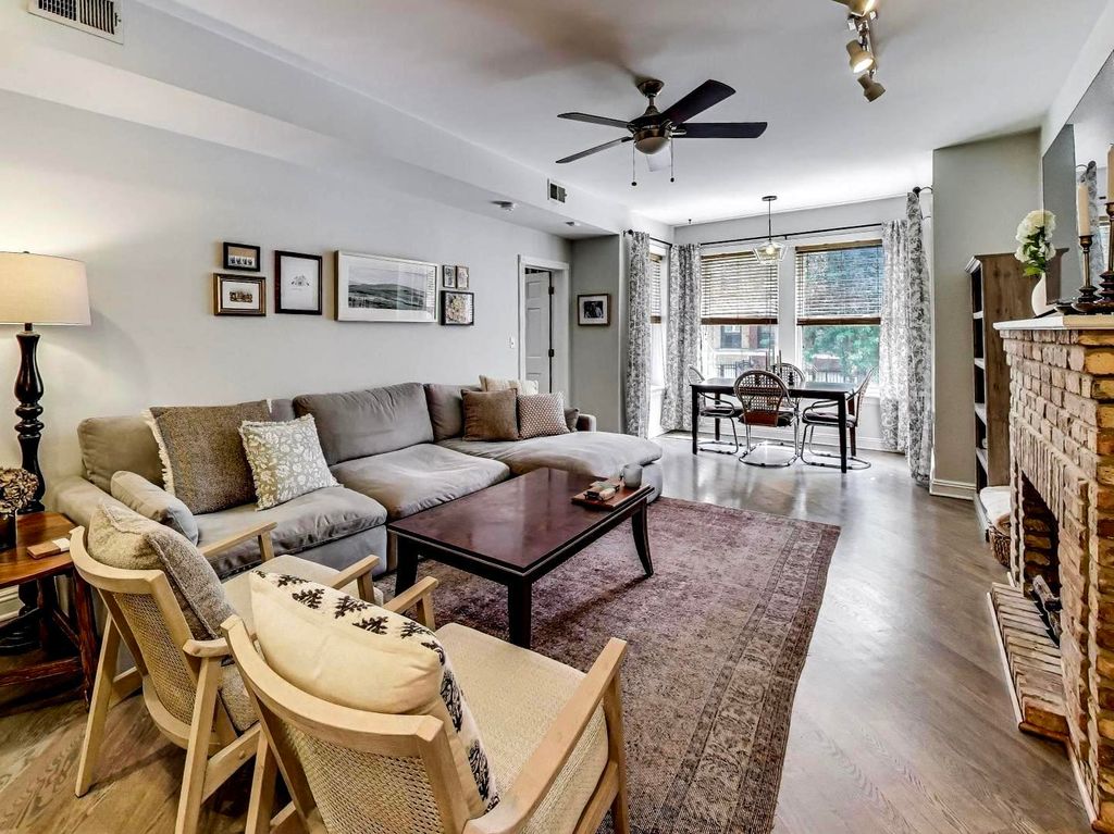Light & bright high first floor condo in PRIME Logan Square location! Beautifully upgraded. Hardwood floors throughout. Large living room and dedicated dining space. Brick fireplace. Eat-in kitchen with white cabinets, granite, backsplash, and SS appliances. Large primary suite w/attached bathroom & professionally organized walk-in closet. Spacious 2nd bedroom accommodates a bed and office space. Massive storage unit in the basement below the unit has untapped potential. Perfect location- tree lined street- two blocks to the Blue line and minutes to the square, shopping and restaurants.