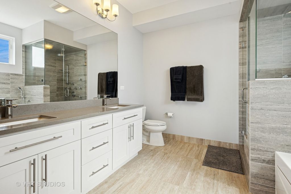 Top-floor comfort with unbeatable outdoor space and skyline views! This spacious top-floor unit spans half of an 8-unit elevator building and offers incredible panoramic views from a private rooftop deck-perfect for entertaining, relaxing, or soaking in the city skyline. Fully decked out, with a section of artificial turf, the outdoor space invites endless design possibilities. Inside, enjoy nearly 1,700 square feet of beautifully maintained living space in this 3-bedroom, 2-bath home built in 2016 and meticulously cared for by its original owner. The open-concept kitchen is a chef's dream, featuring quartz countertops, high-end appliances, and tall white cabinetry offering exceptional storage. The spacious primary suite, located at the rear of the unit for added privacy, boasts a walk-in closet and a luxurious en-suite bath complete with heated floors, a soaking tub, and a steam shower. Additional highlights include in-unit laundry, hardwood flooring throughout, soaring 9+ foot ceilings in living room, and abundant natural light from the home's south, east, and west exposures. Enjoy even more outdoor space with a front balcony off the living room and a second balcony off the primary suite. Elevator access takes you directly to your garage parking space-included in the price. Nearby is the highly sought-after Prescott Elementary School, and this home is just steps from Midtown Tennis, Target, Mariano's, and the vibrant shops and restaurants of the Clybourn Corridor. Commuting is a breeze with easy access to the expressway and the Sheffield Red Line stop less than a mile away.