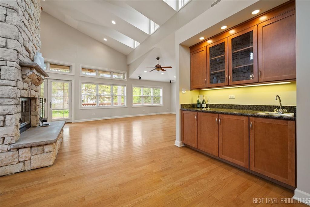 Stunning custom ranch with finished basement with 9-foot ceilings and open-concept living! Step through frosted French doors into a tray-ceiling foyer with fireplace, vaulted ceilings, wide baseboards, recessed lighting, and hardwood floors. The living and dining areas feature a dramatic floor-to-ceiling stone see-through fireplace and sun-filled clerestory windows. Entertain with a wet bar, built-in buffet, and dual access to a massive deck overlooking a private fenced backyard with mature landscaping. The chef's kitchen includes custom cabinetry with slide-out drawers, granite island with seating, double ovens, pendant and under-cabinet lighting, and a pantry. Spacious primary suite offers vaulted ceilings, dual walk-in closets, private deck access, and a spa-like bath with skylight, dual vanities, jetted tub, and walk-in shower. Two additional main-level bedrooms plus a third full bath, and a laundry area complete the main floor. The finished basement includes a large family room, guest bedroom with full bath, and abundant storage. Zoned HVAC, new roof (2021), high-efficiency water heater (2021), LeafGuard gutter system, and oversized 2-car garage. Move-in ready, perfect for entertaining, and full of luxurious touches!