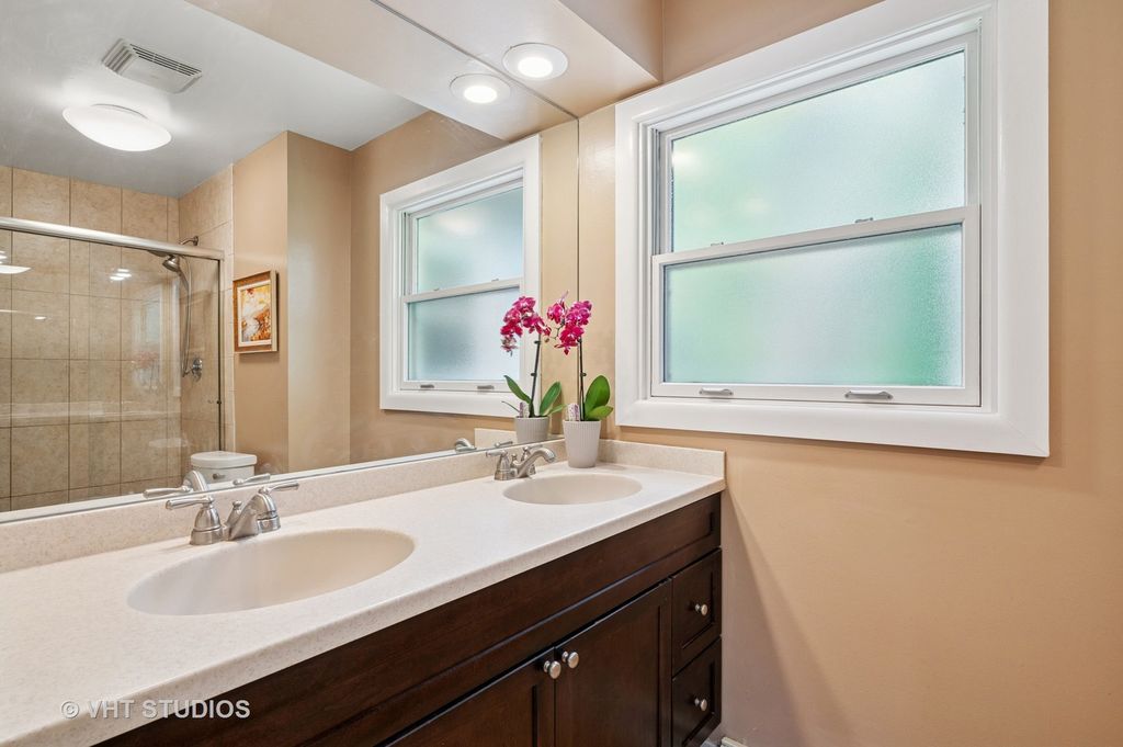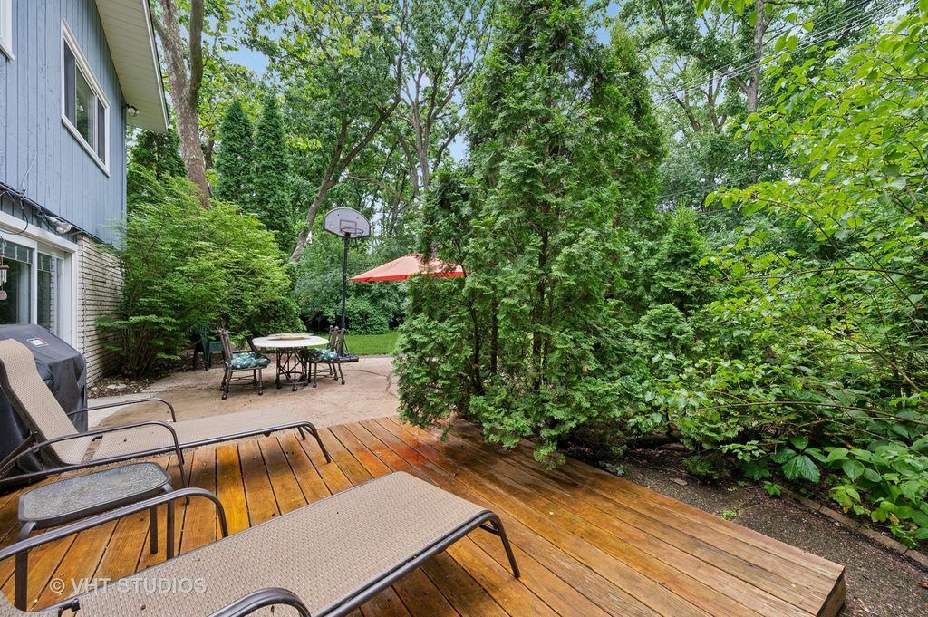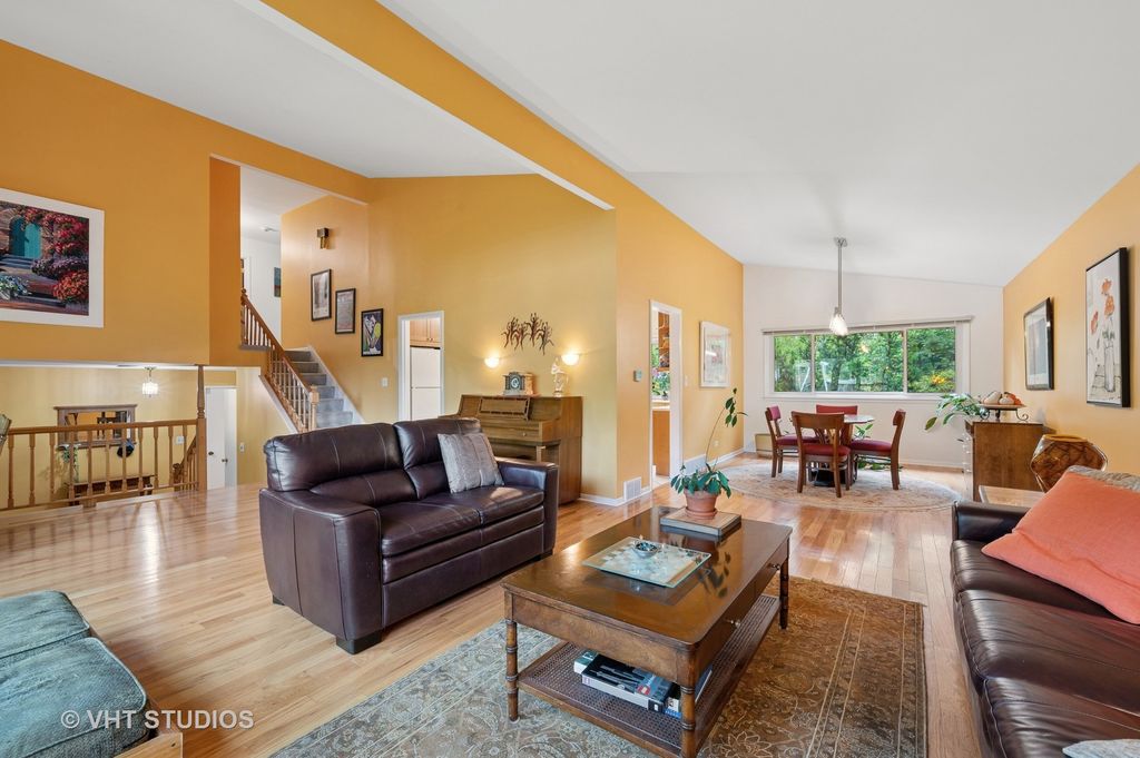 Welcome to this light filled 4 / 2.1 Mid-Century Modern Multi-Level home in the Highlands. The open Foyer greets you with gleaming oak hardwood floors and a short staircase up to the Living Room, featuring huge Pella picture windows, oak hardwood floors and shares a spacious vaulted ceiling with the Dining Room. The vaulted ceiling in the updated Kitchen gives the sensation of the Canadian cherry wood cabinets floating on air, several with glass doors. Relax in your bright Family Room with oak hardwood floors, wood burning fireplace and Pella blinds-between-the-glass sliding glass doors leading to the patio and adjacent deck. The Upper Level is recently carpeted: the Primary Bedroom is ensuite with step-in shower with Platinum Euro series glass doors, heated floor, double sink and Pella privacy windows. Three additional bedrooms, one with a walk-in closet and laundry chute, and hall bath with double sink and Pella privacy windows, round out the Upper Level. The partially finished basement has built-in desks, cabinets, currently a designated fitness area, Storage room and Utility room. A double level deck off the kitchen and patio provide plenty of seating to enjoy the large fenced in back yard. Roof: 2022, Driveway: 2020.