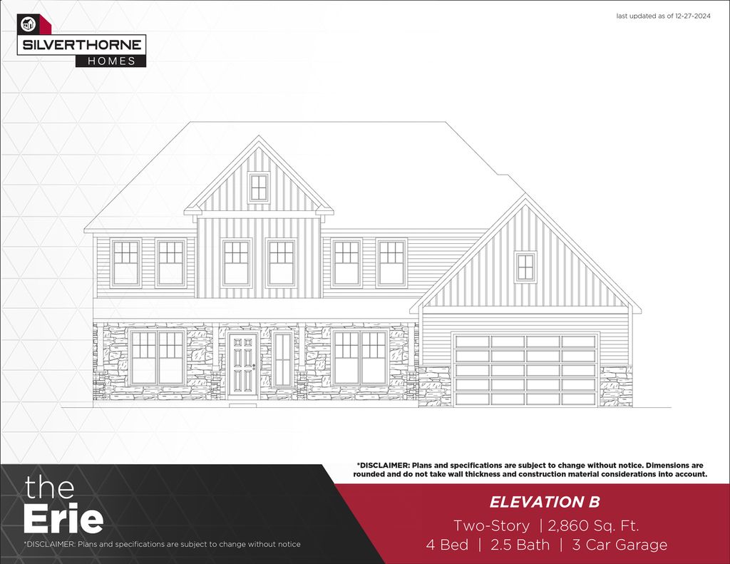 Proposed new construction. Spanning 2,860 square feet, The Erie is a thoughtfully designed home that perfectly balances style, comfort, and functionality. With four bedrooms, two and a half bathrooms, and a host of flexible spaces, this home is built to fit your lifestyle while offering the perfect setting for both everyday living and entertaining. As you enter through the two-story foyer, you'll be greeted by an open and inviting layout. The main floor boasts a spacious flex room, perfect for a home office, playroom, or formal sitting area, along with a separate living room for additional gathering space. At the heart of the home, the large kitchen features an oversized walk-in pantry and flows seamlessly into the breathtaking two-story great room, making it an ideal spot for entertaining or enjoying quality time with loved ones. Upstairs, you'll find three generous guest bedrooms and a stunning owner's suite. The owner's retreat is thoughtfully designed with privacy in mind and features a spacious layout, a luxurious private bath with dual vanities, a walk-in shower, and a closet. Completing the home is the included two-car garage with a tandem third car bay, offering plenty of space for parking, storage, or creating the workshop you've always dreamed of. With its elegant design, functional spaces, and timeless appeal, The Erie is the perfect place to call home and create memories for years to come.
