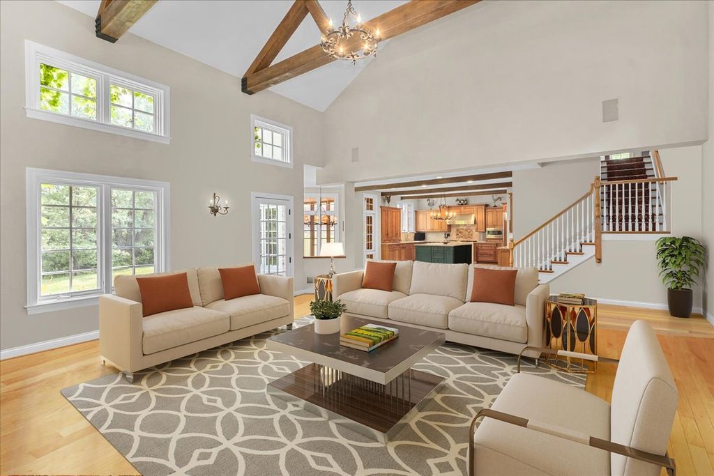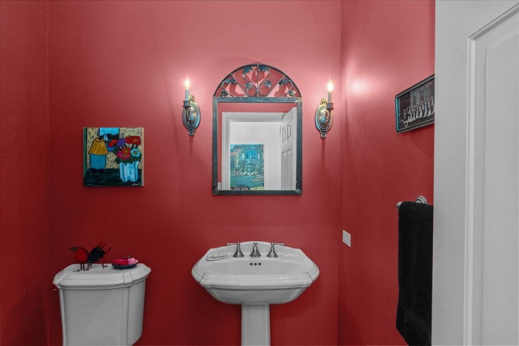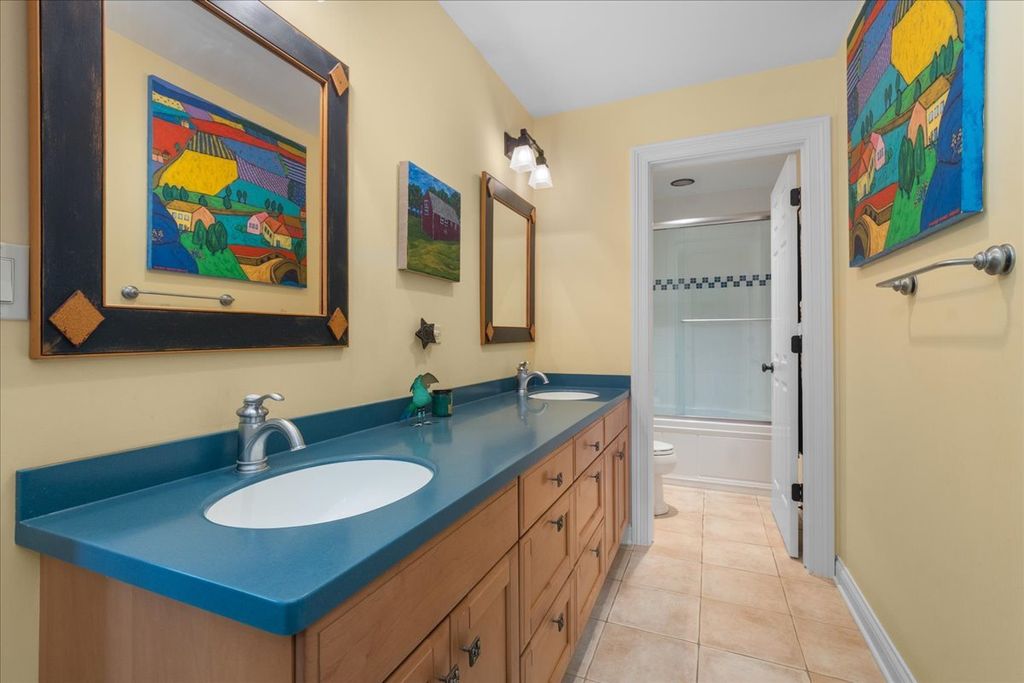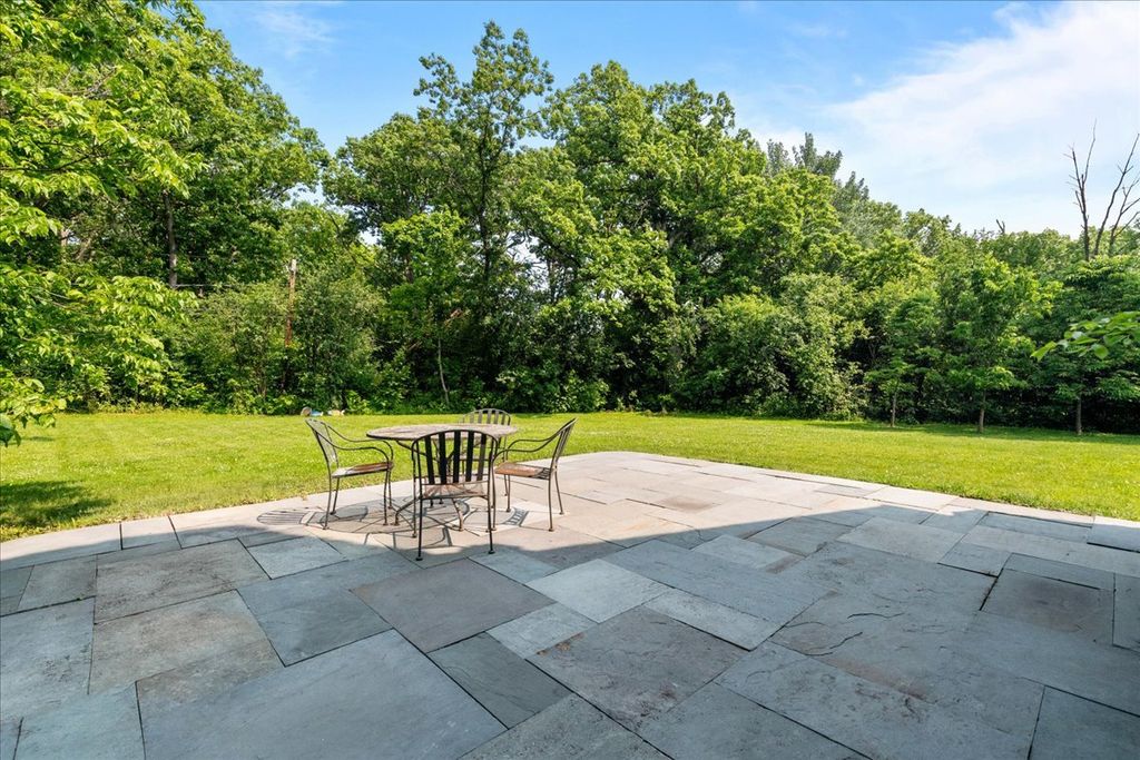 Fabulous opportunity to own this custom-built 5-bedroom, 4 full and 2 half bath home in Riverwoods, perfectly situated on over an acre of private, wooded land surrounded by nature and wildlife. With charming curb appeal, the home features a striking brick exterior, turret and porte-cochere. Designed with elegance and functionality in mind, this residence boasts high-end finishes, soaring ceilings and expansive windows that fill the home with natural light. The grand center-entry foyer with double height ceiling opens to a beautifully appointed dining room with a wall of windows overlooking the front yard and access to a butler's pantry. The spacious living room with a wood-burning fireplace provides serene views of the pristine backyard, while the inviting great room impresses with faux wood-beamed vaulted ceilings, built-ins, a stone fireplace, transom windows and a door leading out to the bluestone patio and lush yard. The open-concept kitchen is a chef's dream, featuring wood cabinetry, granite countertops, high-end stainless steel appliances, custom backsplash, an expansive island with seating and a sunlit breakfast area with oversized windows. The adjacent screened-in porch with wood paneling is the perfect spot to unwind and enjoy the surrounding landscape. A large sunlit home office with French doors plus a mudroom with built-in storage, a half bath, laundry room and access to the oversized 2-car garage enhance the functionality of the main level. A bonus room next to the garage offers ideal space for an art studio, gym or second office. The second floor features a bridal staircase that leads to a generous landing overlooking the foyer. The luxurious primary suite features a tray ceiling, professionally organized walk-in closet and a spa-like bath with a marble-topped double vanity, Kohler soaking tub, oversized shower and private commode room. Four additional spacious bedrooms with walk-in closets, 2 with en-suite baths and the other 2 share a Jack and Jill bath. A large bonus room is perfect for a kids' lounge or study area. Access to a private deck that overlooks yard is the ideal place to relax. A second laundry room completes the upper level. Unfinished lower level has endless possibilities with over 3,400 sq ft of additional space, including roughed-in plumbing for a bathroom. The beautifully landscaped yard with mature trees, bluestone patio with an outdoor fireplace, and total privacy offers a tranquil outdoor oasis. Additional highlights include hardwood floors throughout most of the home, abundant storage and a new roof (2023). This meticulously maintained and thoughtfully designed home is move-in ready. A rare gem!