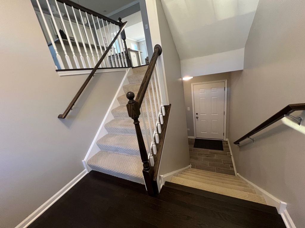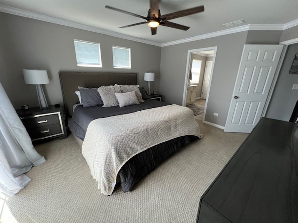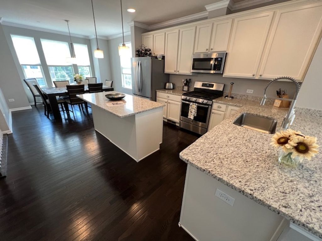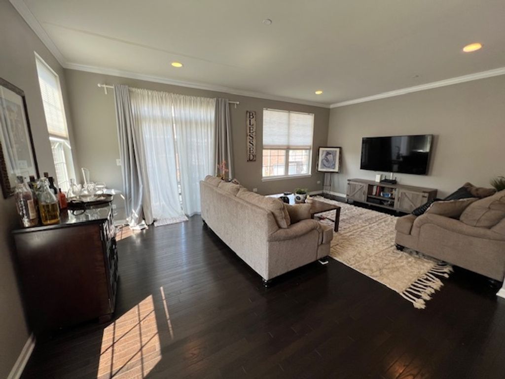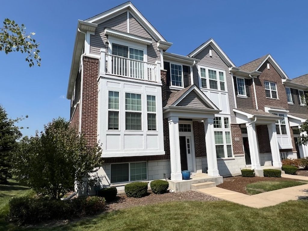 This beautifully upgraded Foster model end unit built 2019 offers exceptional style and convenience in a sought-after Emerson Park location. SUPER LOW RATE assumable mortgage available for qualified FHA buyer. The open-concept main level features rich dark hardwood flooring throughout, beginning with a versatile front flex room-perfect as a living room or formal dining area-that flows seamlessly into the gourmet kitchen. The kitchen is a true showpiece, with a center island, white 42-inch soft-close cabinetry, granite countertops, and stainless steel appliances, including a Whirlpool French door refrigerator, GE oven/range, and GE dishwasher. The spacious 20' x 13' family room offers plenty of space for entertaining and opens to a private balcony. Hardwood flooring continues on the second-floor landing and into the huge loft, ideal as a media space or additional living area. The luxurious primary suite boasts its own private balcony, a walk-in closet with custom organizers, and a spa-like primary bath with dual-sink vanity, walk-in shower with designer tile, and a linen closet. The second bedroom features an attached full bath complete with a deep soaking tub and designer ceramic tile on both the walls and floor. A bright 5' x 3' laundry room with window comes equipped with a Whirlpool washer and dryer. The finished lower-level bonus room makes a perfect home office, workout area, den or possible 3rd bedroom. Additional highlights include custom window treatments (blinds and curtains), designer lighting, and a move-in ready condition-it's all been done for you. Enjoy the unbeatable Emerson Park location, within walking distance to the Metra Park & Ride and Wolf Crossing Community Park, and served by highly rated District 204 schools.