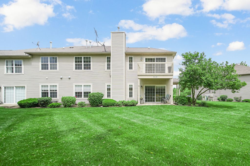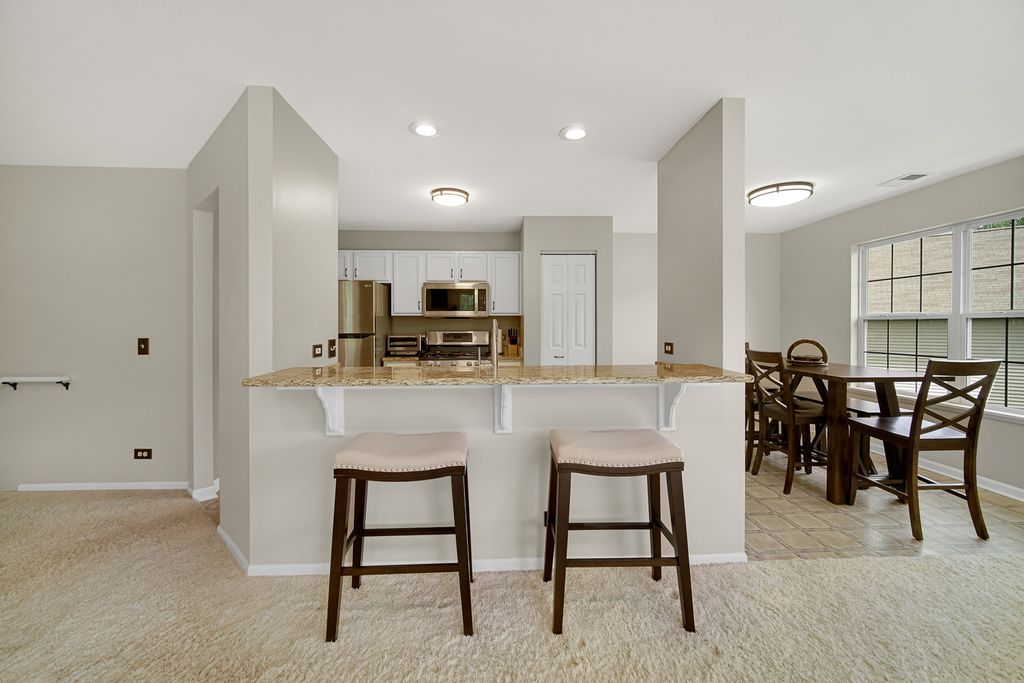 Welcome to this beautiful light and airy townhome with stunning private vistas and lots of luxurious upgrades throughout. This lovely 3 Bedroom/2 Bath home features an expansive living area with gas fireplace, lots of windows bringing in natural light, sliding door to large balcony overlooking expansive green space and trees, large dining area, kitchen with granite counters, and breakfast island with room for stools. Custom recessed lighting in the living area with multiple settings. Master Suite features two walk-in closets, private bath with heated floors, hydro massage tub, and beautiful vanity. Graceful second and third bedrooms with shared hall bath featuring soaking tub and shower. HVAC, Water Heater, 3M window light filtering film are newer and replaced around 2017. Fabulous location close to Prairie Trail, parks, shopping, and so much more. This home and location is simply divine!