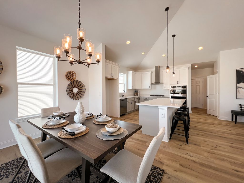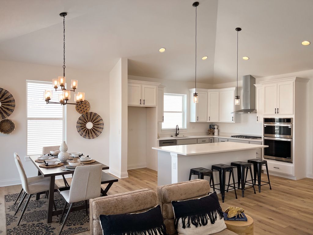 Proposed new construction. The Ashbury model offers an impressive list of amenities in a manageable package. Cathedral ceilings and a beautiful fireplace accentuate an impressive great room which opens into a dining area and kitchen, all lined by hardwood floors. And with granite countertops, 42" dovetail cabinetry, soft-close drawers and crown molding, the kitchen provides the practicality and luxury that every chef covets. The kitchen leads into a laundry room that connects to a spacious three-car garage. Opposite the laundry room, you'll find three bedrooms and two bathrooms, highlighted by an opulent master bedroom featuring tray ceilings, and a serene master bath with double sinks, soaker tub and separate shower. Homes built with smart home technology from Honeywell, Schlage, and Lutron. Pictures of previously built homes, some with upgrades.