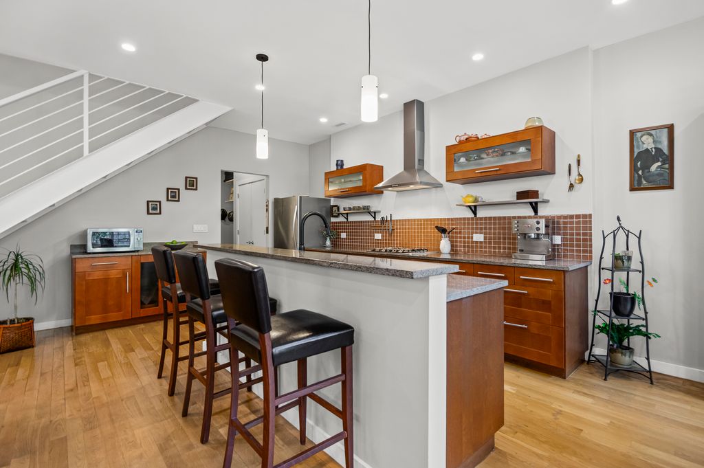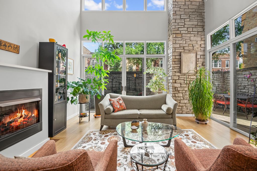 Bright and airy duplex-up in a boutique 6-unit building with the privacy of your own exterior entrance and the convenience of an attached heated garage. The open layout features a dramatic two-story living room with a stone fireplace, floor-to-ceiling windows, and glass doors to a large private patio-perfect for relaxing or entertaining. The modern kitchen boasts granite countertops, stainless steel appliances, and a breakfast bar, offering both style and functionality. The primary suite is a true retreat with dual sinks, a jetted tub, a separate shower, and walk-in closet. Two additional bedrooms and 2.5 total baths provide flexibility for guests, an office, or a growing household. Enjoy hardwood floors throughout, in-unit laundry, and access to a shared rooftop deck with panoramic city views. All just steps from the Kedzie Brown Line, parks, cafes, and neighborhood dining.
