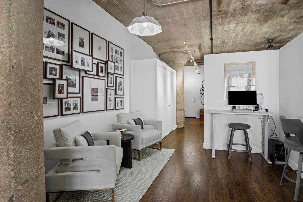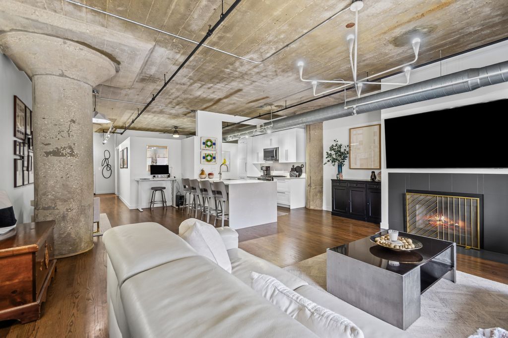 In the heart of fabulous River North, once again welcoming you to the iconic Ontario Street Lofts! This special one -bedroom one bath residence has been completely meticulously renovated to the nines, blending modern luxury with authentic loft character. The striking white chef's kitchen sporting custom designed cabinets and a stunning quartz island, doubling as both an generous prep space then seamlessly doubles as a dining table, perfect for entertaining or everyday meals . Spacious bedroom with neutral finishes, ceiling fan and and updated bath with rain forest shower. The open concept floorplan offers over 1100 sq ft. with hardwood floors, wood burning fireplace with marble surround , concrete ceiling and pillars, custom window treatment, nest thermostat, in- unit laundry and beautiful south sunlight throughout the day and at night a dazzling view of the city! Unit also includes one indoor heated parking space #28 with no extra tax or assessment and private storage locker #323, pets welcomed.