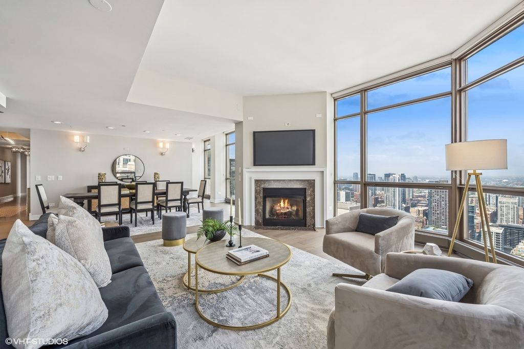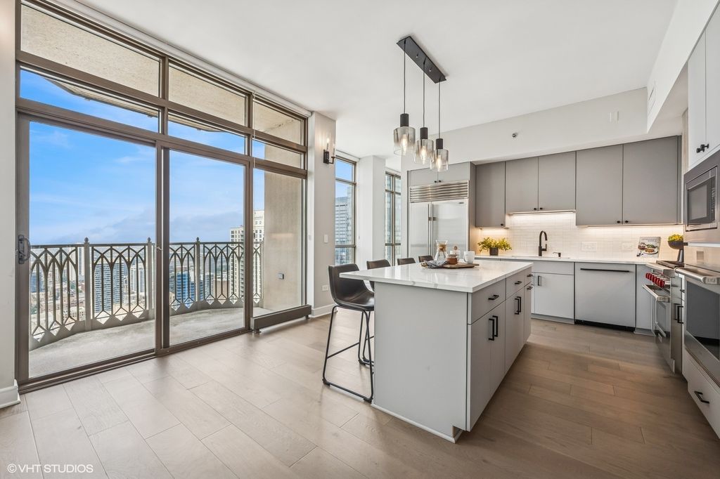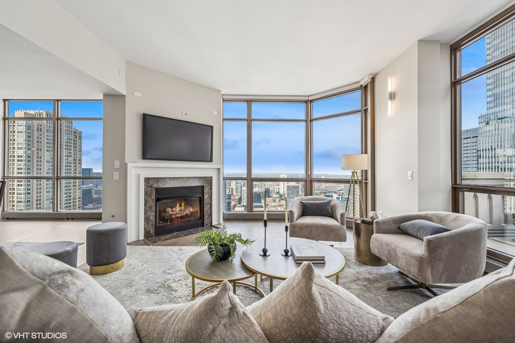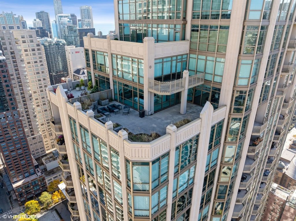 Unmatched LUXURY in the Heart of the Cathedral District. Welcome to an extraordinary PENTHOUSE RESIDENCE in the prestigious PINNACLE BUILDING-a half-floor home that blends sophisticated design with sweeping, unobstructed skyline views. This ONE-OF-A-KIND property offers TWO EXPANSIVE TERRACES AND A PRIVATE BALCONY, creating over 1,900 SQUARE FEET OF OUTDOOR LIVING SPACE, 43 floors above the city. A Grand First Impression as you enter through a gracious foyer with CUSTOM INLAY TILE and an elegant tray ceiling, setting the stage for the LIGHT FILLED, open-concept interiors. The dining and family rooms feature FLOOR-TO-CEILING WINDOWS, soaring 10' ceilings, and a GAS FIREPLACE. From here, step onto the sprawling 41' x 39' MAIN TERRACE-complete with IRRIGATION AND ELECTRICAL-ideal for an elevated garden retreat, private entertaining, or simply taking in the panoramic views. The PRIMARY BEDROOM is a sanctuary, featuring two walk-in closets and a spa-inspired ensuite with radiant heated floors, a heated towel rack, soaking tub, and walk-in shower. Direct access to the main terrace allows you to start and end your day surrounded by breathtaking views. The designer CHEF KITCHEN is equipped with sleek light-gray cabinetry, quartz countertops, and a large center island. HIGH-END APPLIANCES include a Wolf oven, Sub-Zero refrigerator, and Miele dishwasher. A sunny breakfast room and beverage bar with wine fridge provide casual elegance, while the SEMI-CIRCLE BALCONY offers a serene spot for morning coffee above the city. Two additional ensuite bedrooms, each with 10' ceilings and stunning views, ensure privacy and comfort. One suite opens directly to the 21' x 18' SECOND TERRACE, perfect for hosting guests or creating a private outdoor escape. Living at the Pinnacle means enjoying a wealth of world-class amenities. Residents have access to an indoor pool and whirlpool, fully renovated cardio and strength-training gyms, and relaxing steam and sauna rooms. An expansive outdoor sundeck is equipped with grills and a fire pit, perfect for gatherings under the city lights. For pet lovers, there's a PRIVATE DOG WALK AND PLAY AREA, while entertainment options include a theater room, a hospitality suite with terrace, and private wine lockers. Additional conveniences include bike storage, a personal storage room, and two deeded parking spaces, with the option to purchase a third. PRIME LOCATION-Just blocks from Northwestern Memorial Hospital, Northwestern Law & Medical School, Lurie Children's Hospital, Michigan Avenue shopping, Ohio Street Beach, and acclaimed dining. This penthouse delivers UNPARALLELED INDOOR-OUTDOOR LIVING in one of the city's most sought-after addresses. Opportunities like this are rare-experience the Pinnacle lifestyle today.