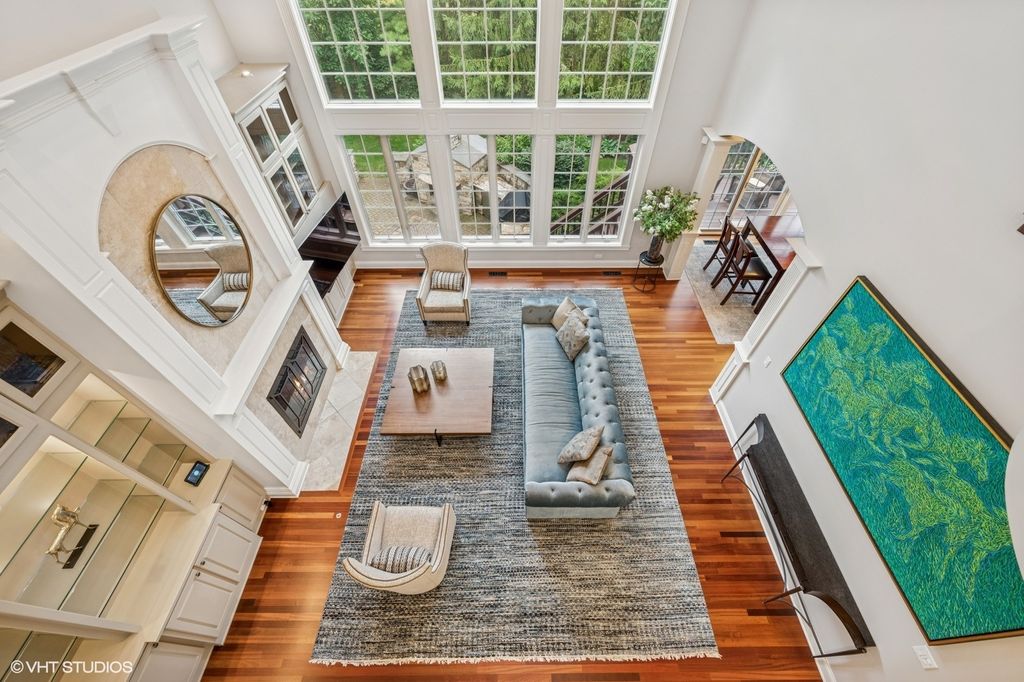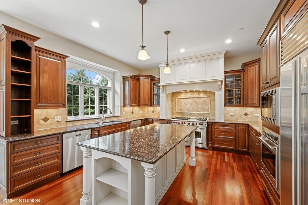 Experience exceptional craftsmanship in this custom stone and concrete stucco home, perfectly maintained and set on professionally landscaped grounds. Enjoy the ultimate private backyard designed for entertaining, featuring a spacious paver patio, built-in grill and bar with refrigerator, pizza oven, and a large pergola providing shade from the afternoon sun. Inside, you'll find exquisite finishes including travertine stone and Brazilian cherry floors, custom tall hand-carved interior doors, and a dramatic two-story great room with a full-wall built-in entertainment center and stone fireplace. The gourmet kitchen boasts glazed white and cherry cabinetry, professional-grade appliances, and a butler's pantry. Additional conveniences include both first- and second-floor laundry rooms. Work or unwind in the stunning library, complete with a coffered ceiling and rich mahogany built-ins.
