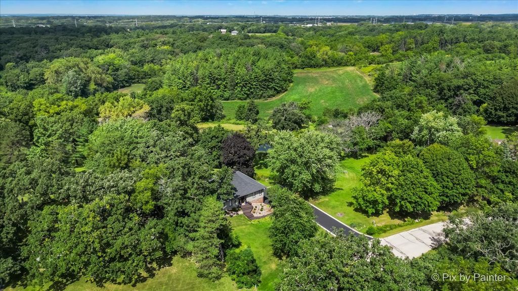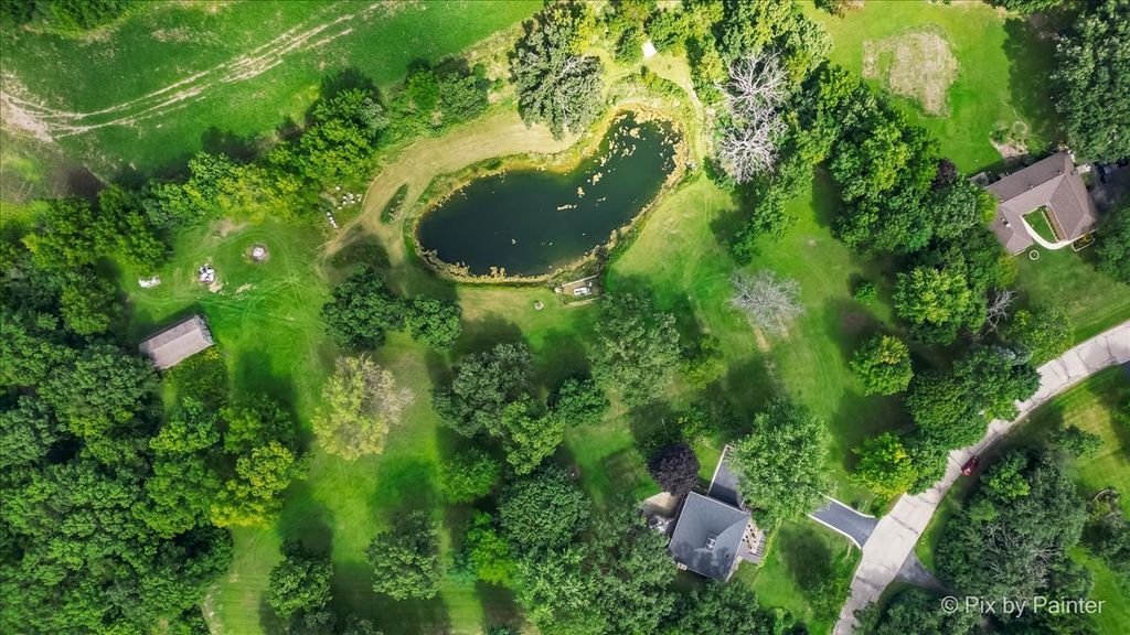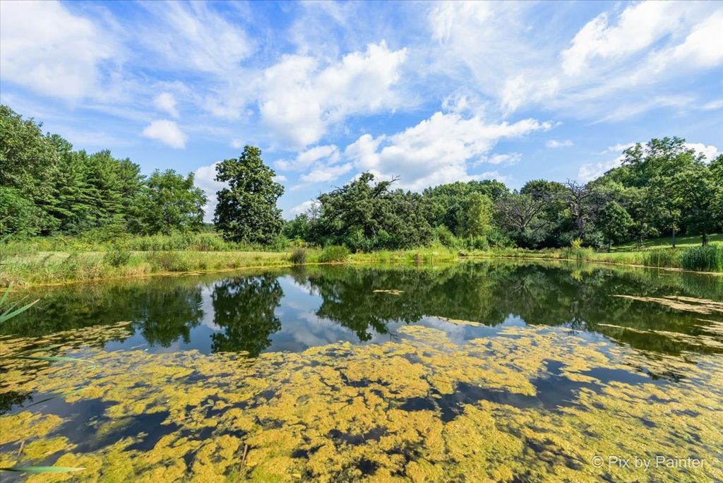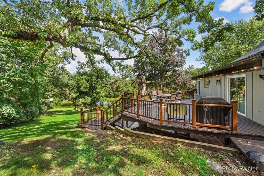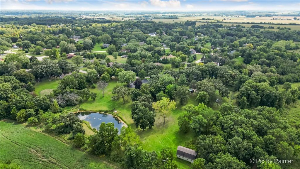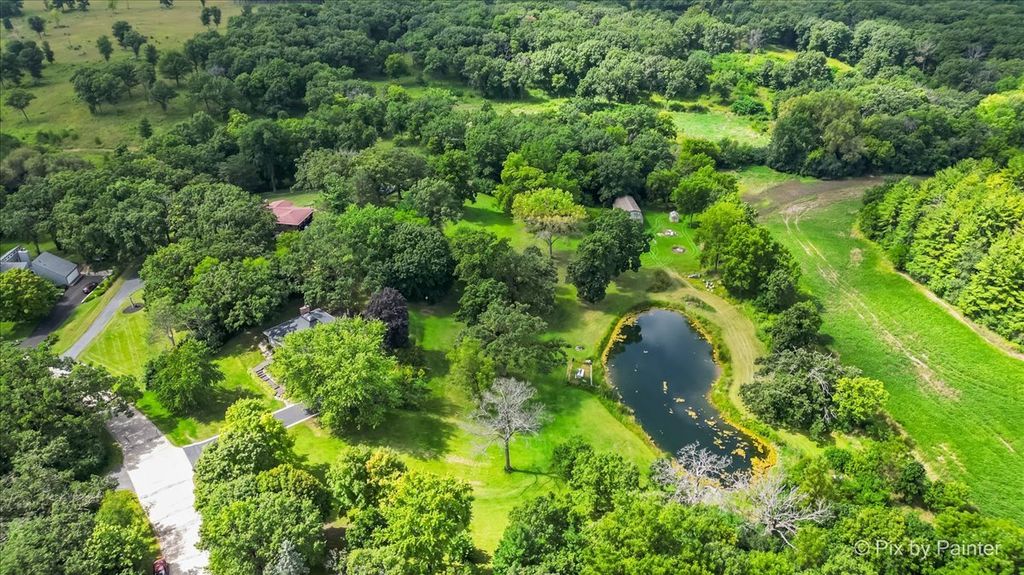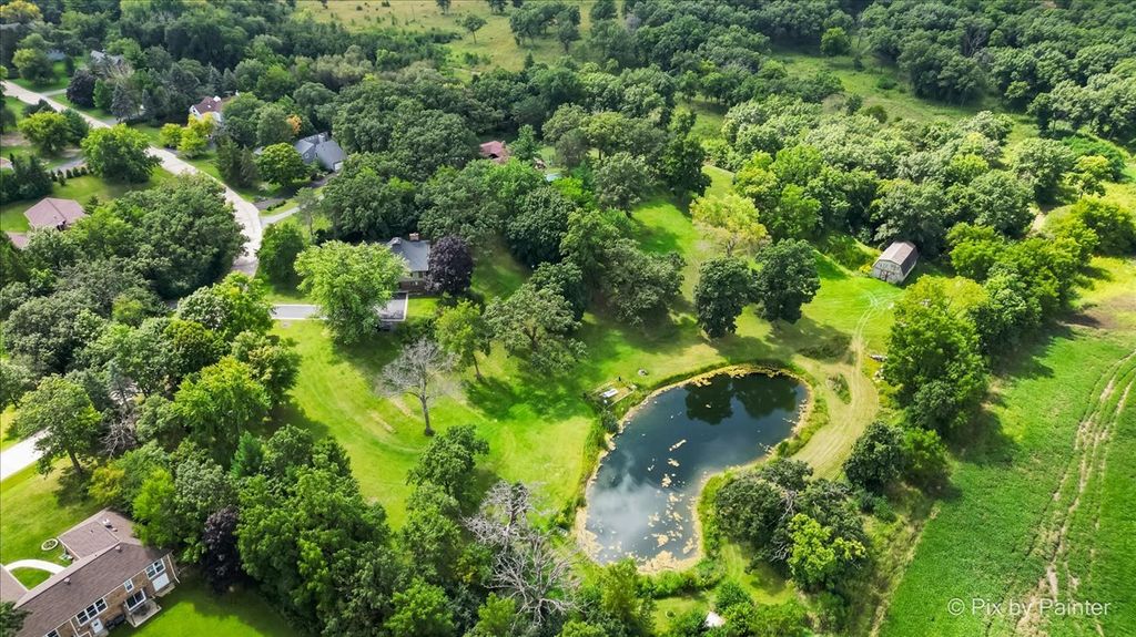 Multiple Offers RECEIVED!!!! You are buying both Lot #1 with the house and a barn and Lot # 2 buildable lot that will give you an option to have almost 5 Acres of One-of-a-Kind Don Erickson Masterpiece with Pond & Barn!!! Designed by renowned architect Don Erickson, a protege of Frank Lloyd Wright, this extraordinary exposed ranch blends timeless design with modern updates. The soaring wood-paneled ceilings peak at the center beneath a dramatic skylight, while clerestory windows line the tops of every room, flooding the home with natural light. Updated home features a new roof (October 2024), new electrical and plumbing (2022), and a remodel completely in 2022-25 -including a brand-new kitchen with an impressive 12-foot island. New Bathroom, New redesigned lower level. The open-concept main level connects the kitchen to the dining and entertaining areas, plus two spacious bedrooms with vaulted ceilings. Step out onto the deck overlooking your private oasis, complete with a pond and barn-perfect for hobby farming, gardening, or simply enjoying nature. The walk-out lower level offers exceptional versatility, featuring two additional bedrooms and a large family room transformed into a stunning master suite with an impressive brick fireplace. Sliding doors lead to another deck area, creating multiple outdoor living spaces. The property itself is a year-round playground-sled down your very own hill in winter, and in warmer months, enjoy swimming, kayaking, and fishing in the pound and near by community lake. Zoned Residential Estate-bring your animals and make it your own! Located in District 158 with Leggee Elementary, Marlowe Middle School, and Huntley High School. A rare architectural gem offering style, space, and recreation in one perfect package!