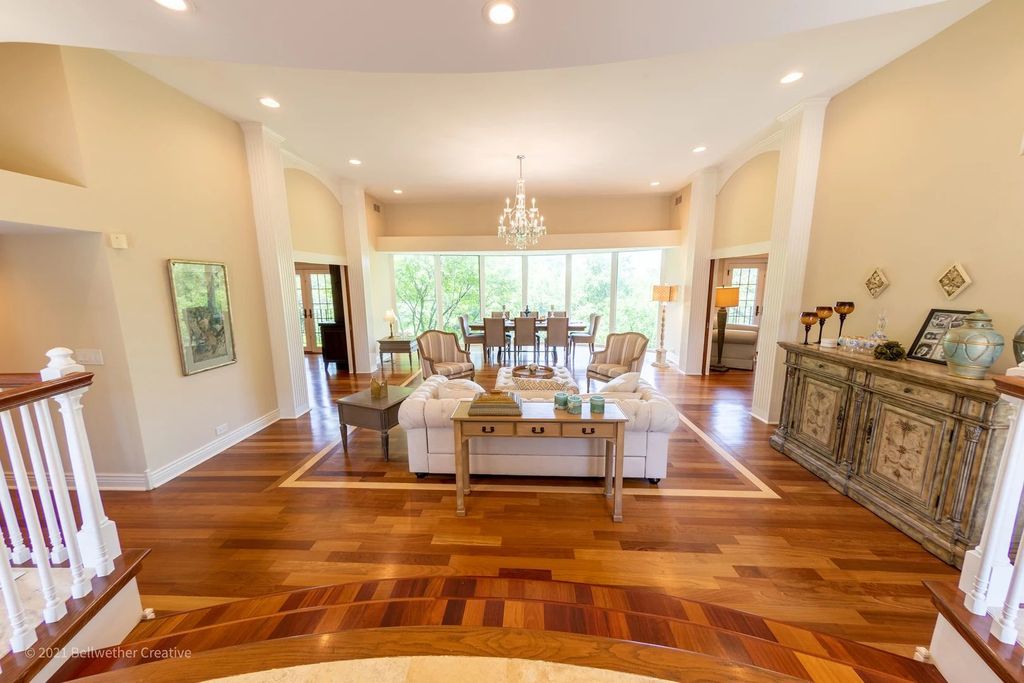 Welcome to 4011 Valley view Rd, a true masterpiece of luxury and craftsmanship, this one-of-a-kind estate offers 5 bedrooms & 6 bathrooms, over 9700 sqft on 6.6 wooded acres, and spanning three meticulously designed levels. Upon entering, your private gate is decorated with 6500 sqft of rich Brazilian Cherry hardwood flooring cross the main living spaces, complemented by an additional 2000sqft of oak flooring in the expansive lower level. Step through the grand foyer into a world of refined sophistication, where floor-to-ceiling windows frame, breathtaking wooded views, and formal dining room sets the stage for memorable gatherings. The spa-inspired master suite rivals the finest luxury retreats, featuring dual full bathrooms, an oversized walk-in closet, a sumptuous soaking tub, a spacious glass-enclosed shower, and a serene sitting area with endless possibilities. The chef's dream kitchen is appointed with top-tier amenities, including dual warming drawers, a built-in espresso machine, dual dishwashers, a premium refrigerator and range, an ice maker, a trash compactor, and a expansive island with abundant counter space. Designed to embrace its natural surroundings, the estate offers multiple outdoor retreats, including a covered patio, a sprawling deck, and private balconies-perfect for savoring the tranquil forest setting. The lower level is an entertainer's paradise featuring a lavish ballroom capable of hosting grand events, alongside a spacious recreation room - totaling over 2000 sqft open gathering space. Architectural grandeur abounds with custom millwork, soaring vaulted ceilings, graceful spiral staircases, and arched passageways, enhancing the home's palatial ambiance. Upstairs, discover three generously sized bedrooms, a family room, and a stately library, complete with hidden passage leading to a secret room and a private observatory with panoramic treetop views. Located within the highly acclaimed Prairie Grove and Prairie Ridge school districts, and just moments from shopping and amenities. This estate offers the perfect blend of seclusion and convenience. Don't miss this rare opportunity to own a truly extradentary residence!