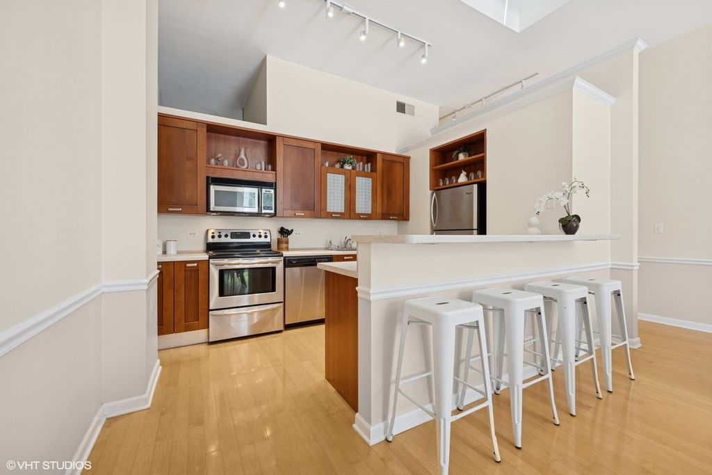 EVANSTON GALLERIA! Fabulous downtown living in a stunning Art Deco building (originally Marshall Field). Top-floor unit in an elevator building. Elegant Italian Bath & Cherry Kitchen w/ large breakfast bar, granite counters, and Stainless Steel Appliances. Hardwood floors throughout & IN-UNIT laundry. Tons of light from oversized window, 12ft. ceilings, & large skylight! Steps to trains, movies, shops, and restaurants & all that downtown Evanston has to offer. Very close to NorthWestern University campus, lakefront & More! Unit heat & Parking space included.