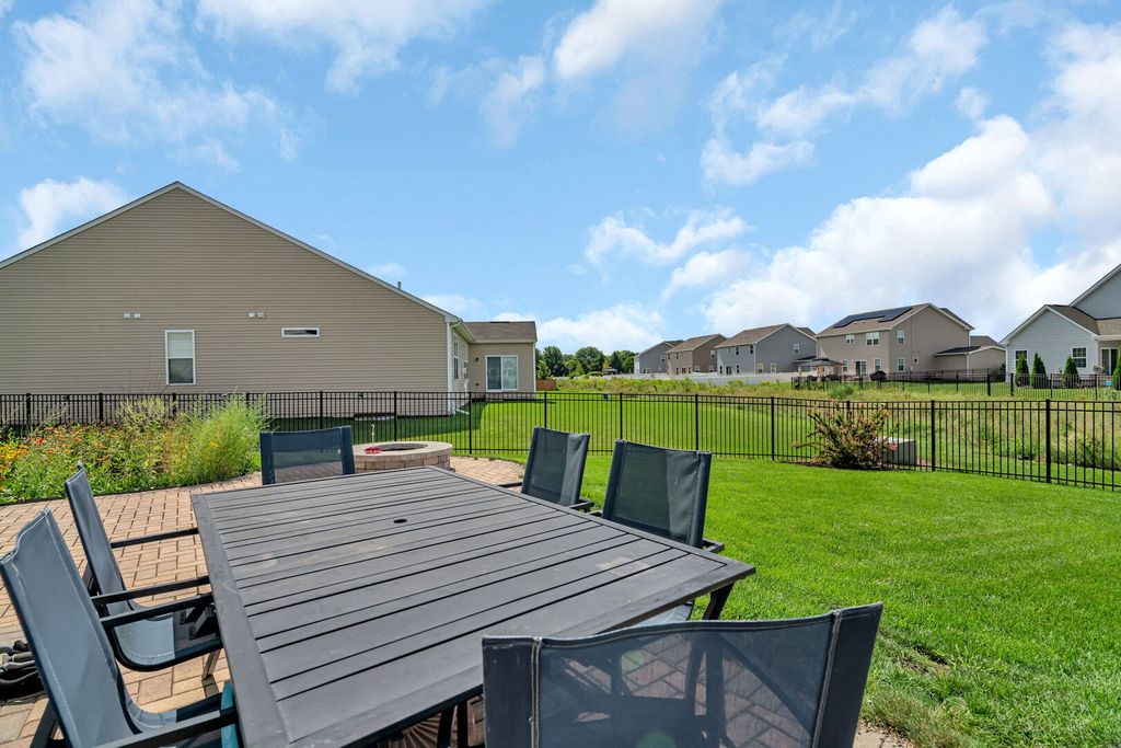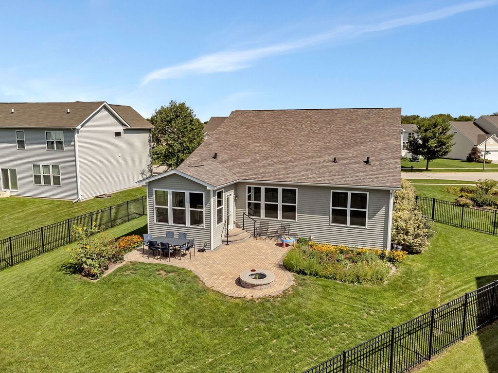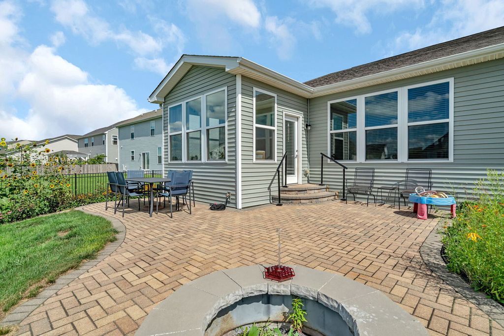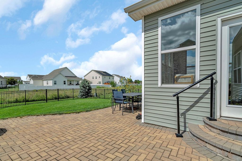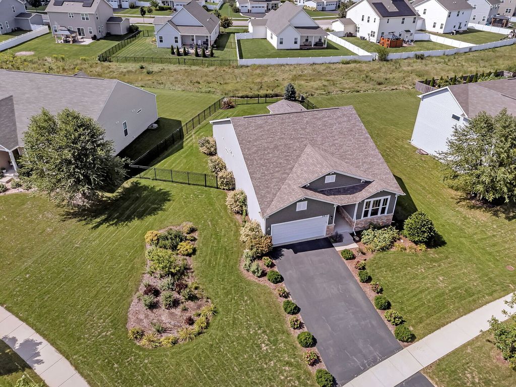 Beautiful 3 Bedroom, 3 Bathroom Ranch with Full Finished Basement & Scenic Yard! This beautifully designed ranch offers 1,969 sq. ft. of main floor living with an open floor plan, 9' ceilings, and a split-bedroom layout for added privacy. The kitchen boasts 42" shaker cabinets, granite counters, breakfast bar, walk in pantry and a large breakfast area for table space, opening to both the family room and a sunroom, an upgraded builder's option perfect for relaxing or entertaining. A "study" nook off the kitchen allows for the perfect work from home situation, home schooling, homework, or crafting, the choices are yours. The master is a suite with walk in closet and private bath. All baths have linen closets and laundry is located on the main floor. 9 foot ceilings and hardwood floors flow through the entire home. The full finished, deep pour, basement expands your living space with a recreation room, playroom, gaming area, and a 3rd full bath. Step outside to a lovely landscaped, fully fenced backyard featuring a kidney shaped paver patio with fire pit, backing to a peaceful open space with native plants. The garage offers a surprise, while it looks like a 2 car, a generous bump-out creates room for a 3rd stall with storage. Interior was painted and roof replaced in 2025, humidifier in 2024.Walk to park and pool. Close to shopping and restaurants. Move-in ready and packed with thoughtful upgrades, this home blends style, function, and comfort.