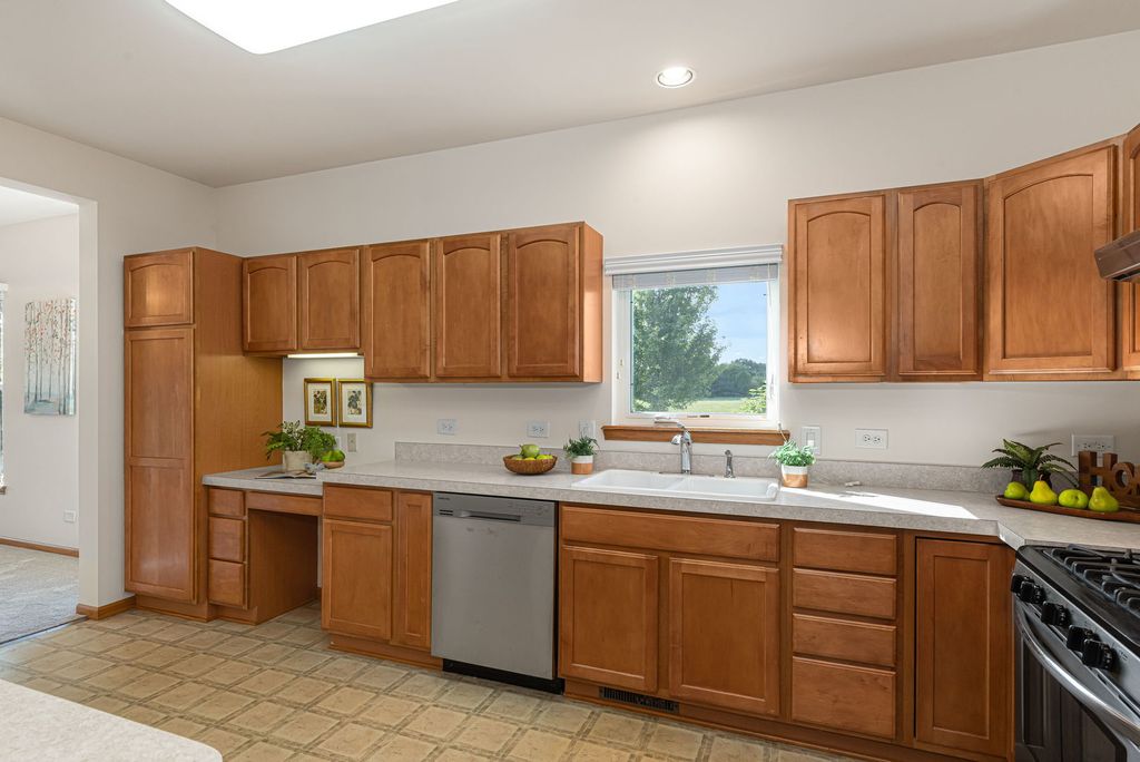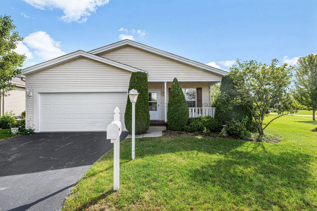 Waterfront Beauty with Sunset Views in 55+ Saddlebrook Farms! Freshly painted and move-in ready with new carpet, this 2 bedroom + office, 2 bathroom home on Blue Heron Lake offers stunning sunset views from your deck and the corner lot. This home is move in ready featuring a newer roof, brand-new furnace, stainless steel appliances, new carpet, fresh paint, hardwood floors, and a 2-car garage with attic storage. Both bedrooms have spacious walk in closets! Don't miss your chance at waterfront living in this desirable 55+ community.