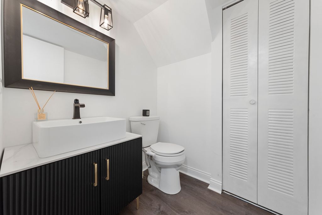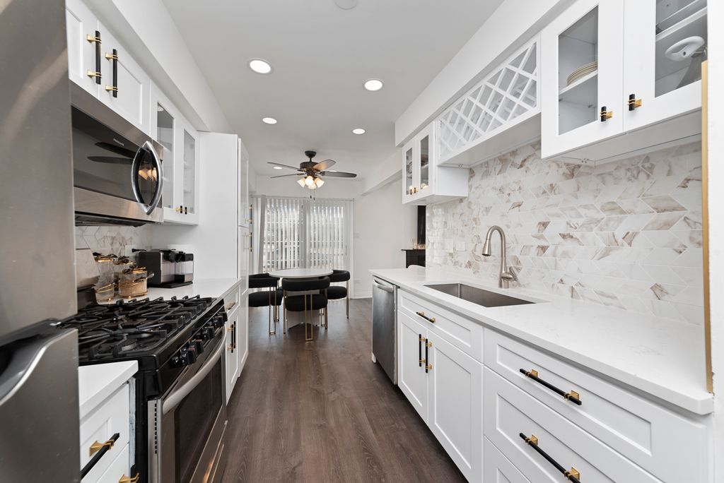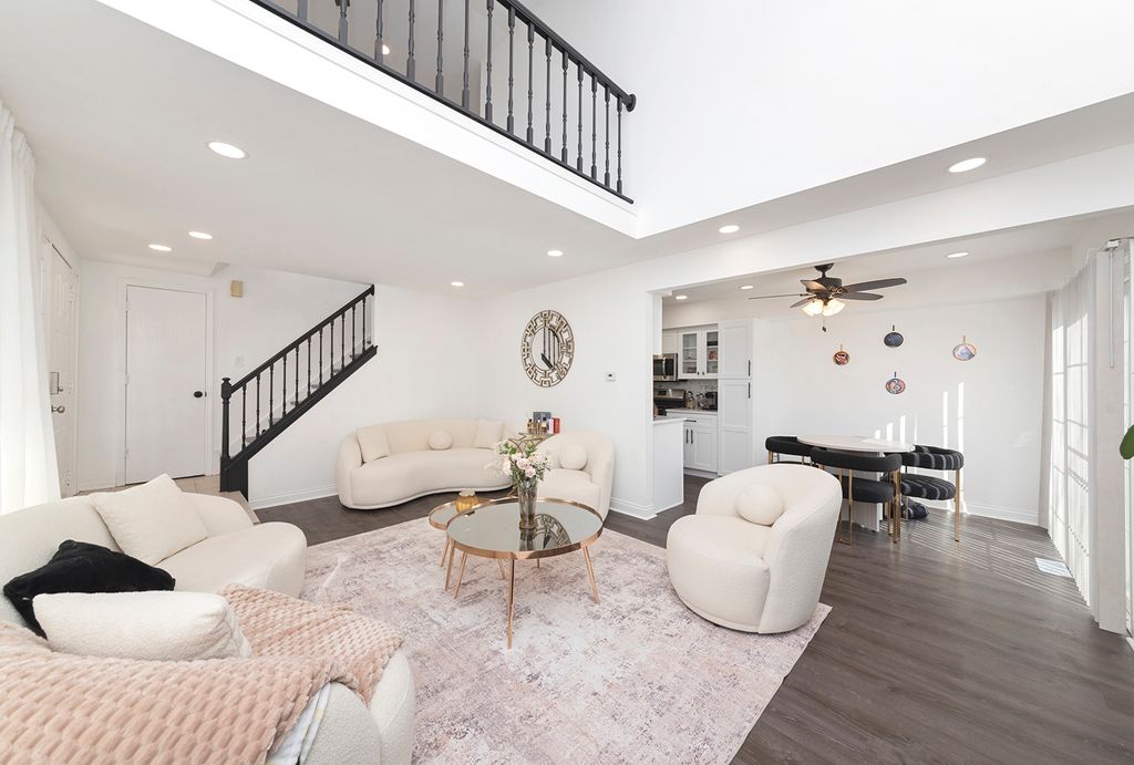 Beautifully Rehabbed Two-bedroom, 1 1/2-bath end unit with a private entrance and a loft that could serve as a third bedroom. The living room features a fireplace, vaulted ceilings, and a skylight. The kitchen is equipped with all stainless steel appliances and a pantry cabinet. The main floor includes laundry with a washer and dryer. The spacious primary bedroom has a walk-in closet and a pass-through door to the shared bathroom. There's also a concrete patio off the kitchen.