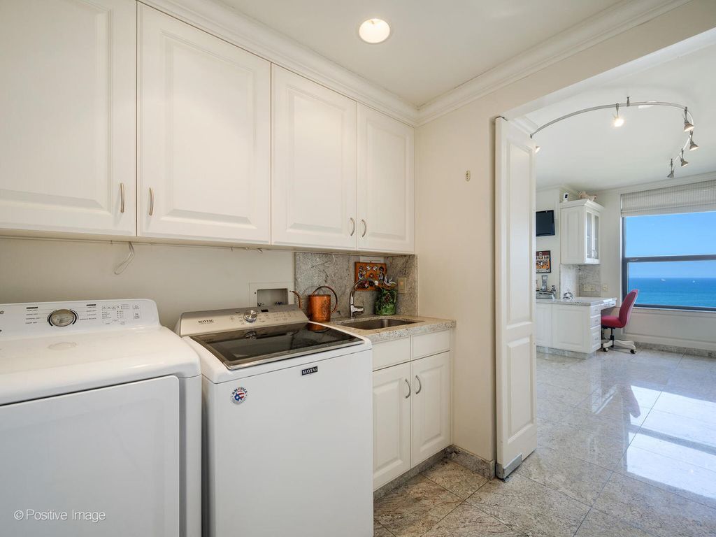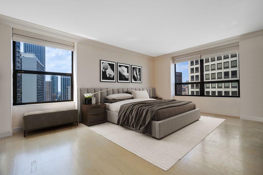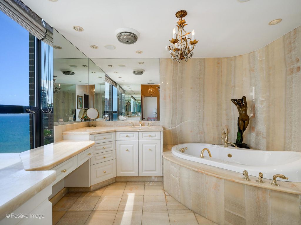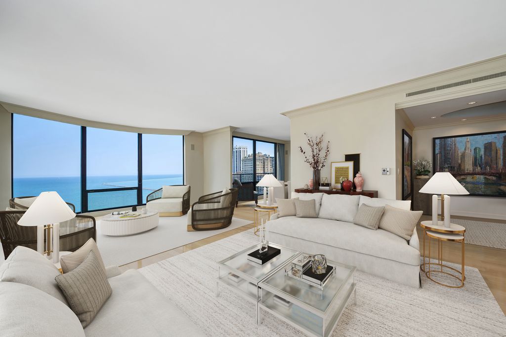 Welcome to this high-floor, preferred-tier corner residence at The Carlyle, offering breathtaking views of Lake Michigan, Oak Street Beach, and the city skyline. Floor-to-ceiling windows and a wide, flowing floor plan provide the perfect setting for both entertaining and everyday living. The spacious eat-in kitchen features granite countertops, stainless steel appliances, abundant cabinetry, a breakfast area, and direct access to a large private balcony. Originally designed as a 3BR + den/4.5BA, the home has been reconfigured: the generous primary suite includes two spa baths and ample closets; the second bedroom features a sitting area, en-suite bath, and large walk-in (formerly a third bedroom with its own bath); and the den, currently used as an office, is marketed as the third bedroom. With full-service amenities and an unbeatable Gold Coast location, this residence presents a rare opportunity to create your ideal home.