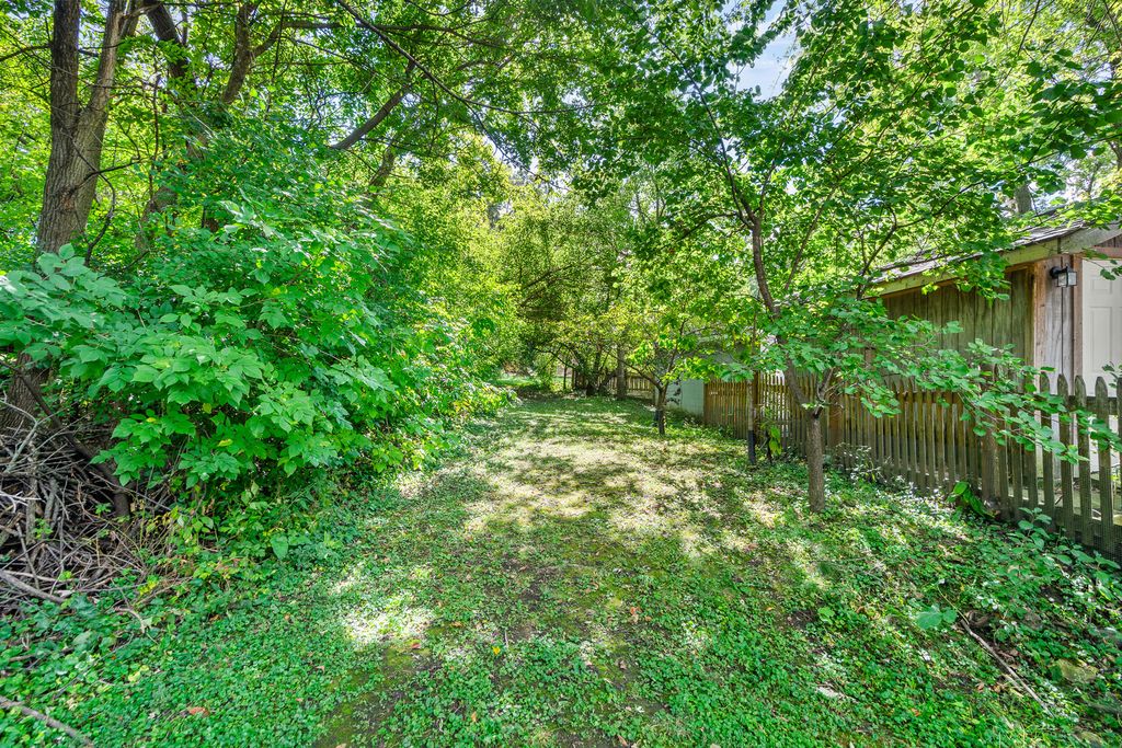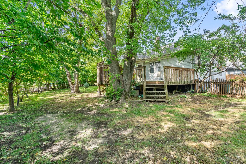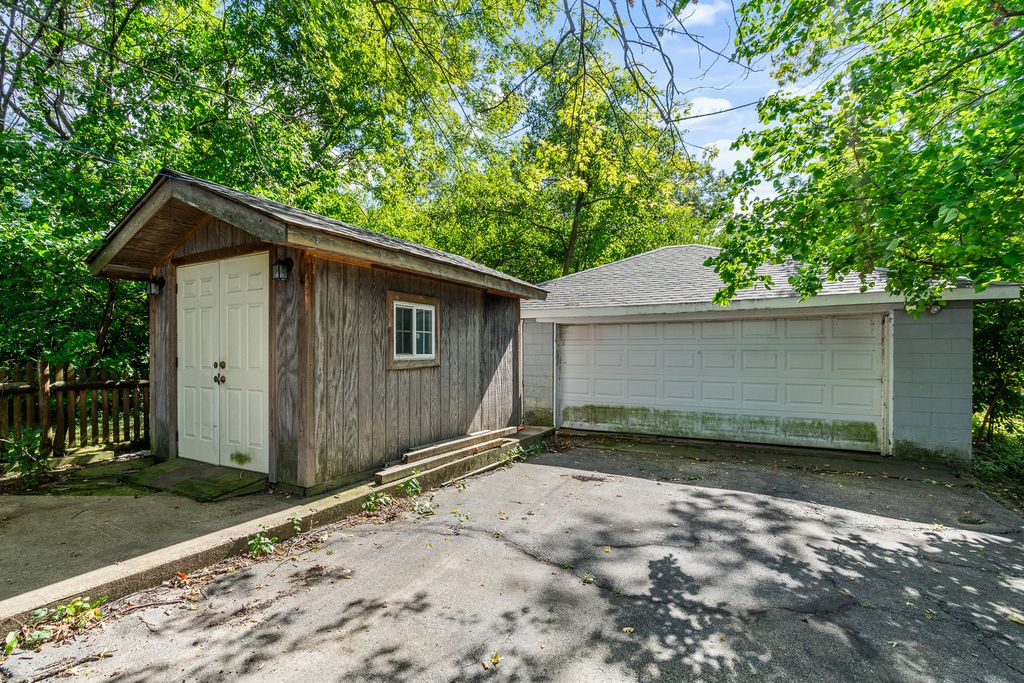 Nestled on a beautifully wooded and private oversized .31-acre lot overlooking scenic Dellwood Park, this charming bungalow is filled with character and timeless appeal. Just a short stroll to the concert area, you can enjoy summer evenings listening to live music in the park. A welcoming enclosed front porch and a separate entry with built-in bench and hooks set the tone. Inside, the living room features a cozy wood-burning fireplace with stone surround and original hardwood flooring. The formal dining room showcases a custom built-in china cabinet, decorative leaded glass window, and a door leading to the deck where you can relax and take in the private yard adorned with several fruit trees. The kitchen offers abundant cabinetry and granite countertops. The main level includes three bedrooms and a full bath with an original clawfoot tub and a convenient laundry chute. A full staircase leads to the unfinished attic, offering the potential for additional living space. The home also provides an unfinished basement, a 2.5-car detached garage, and a shed for extra storage. Updates include a new hot water heater (2023), roof (approx. 2012), and brand-new air conditioner (2025).