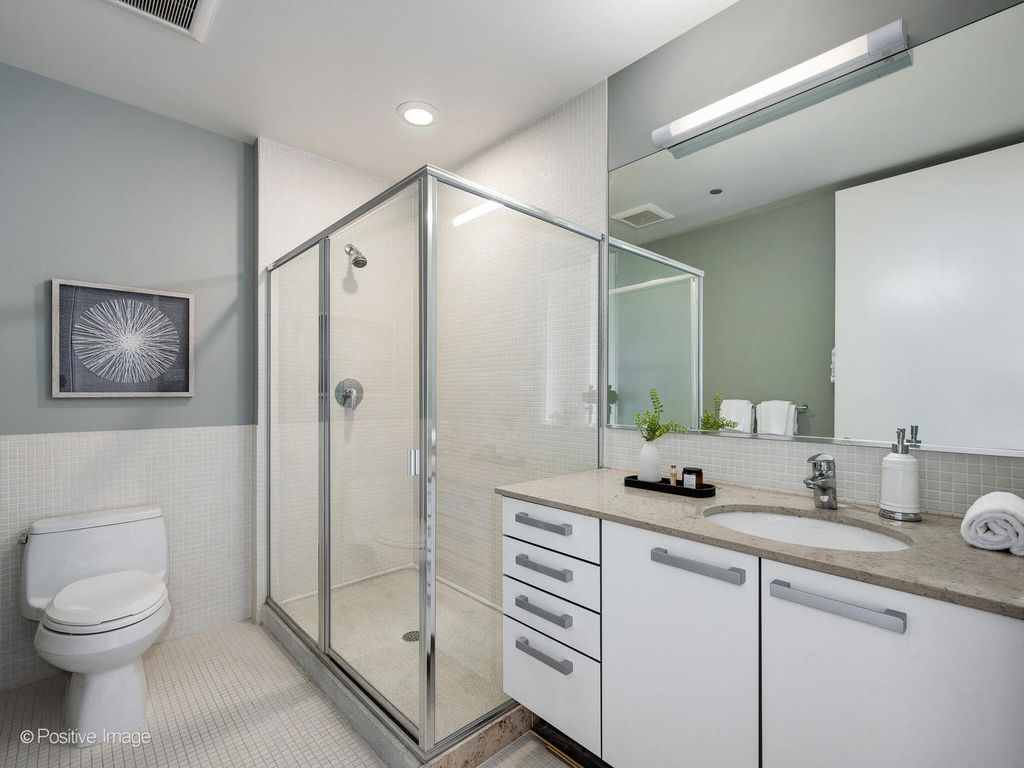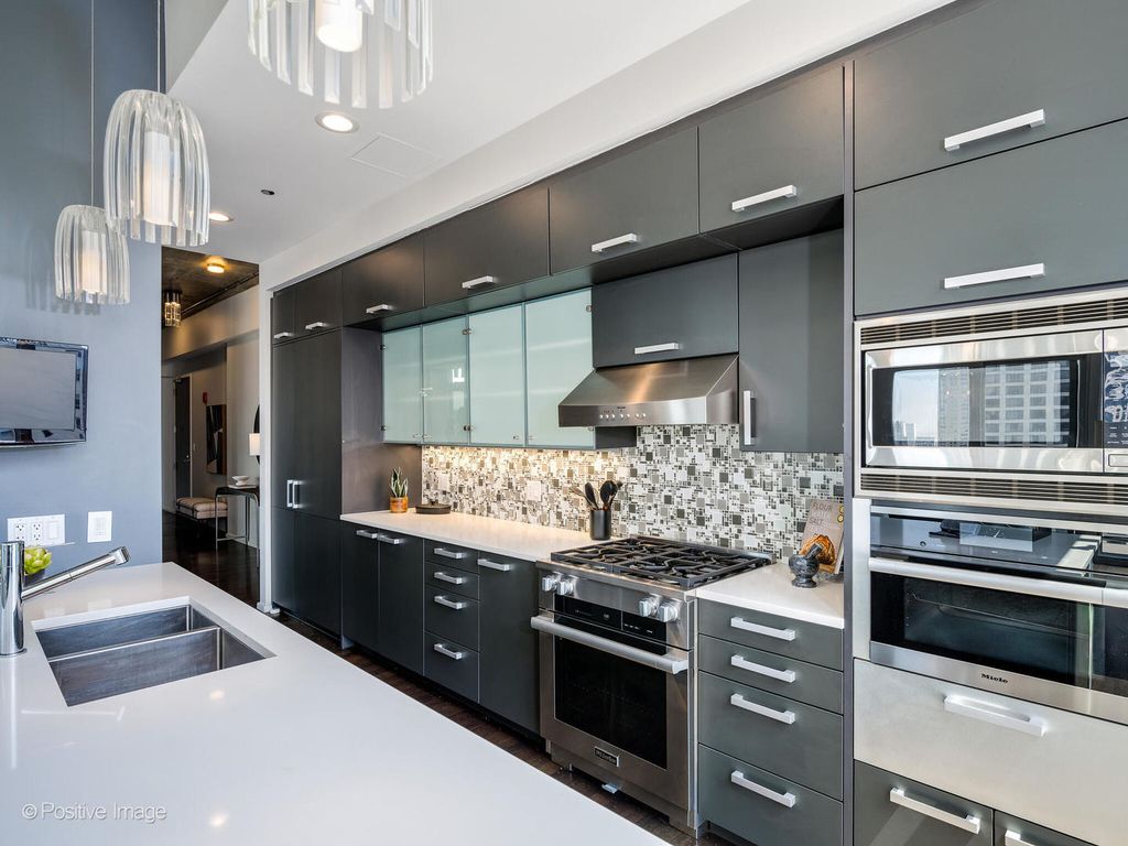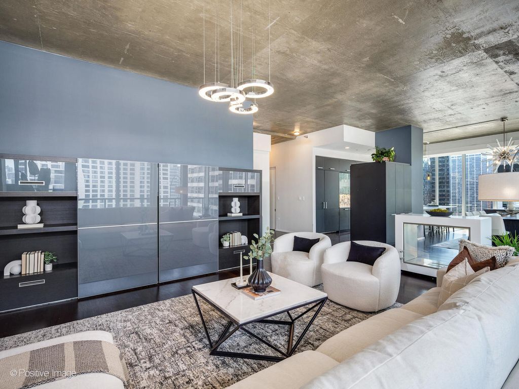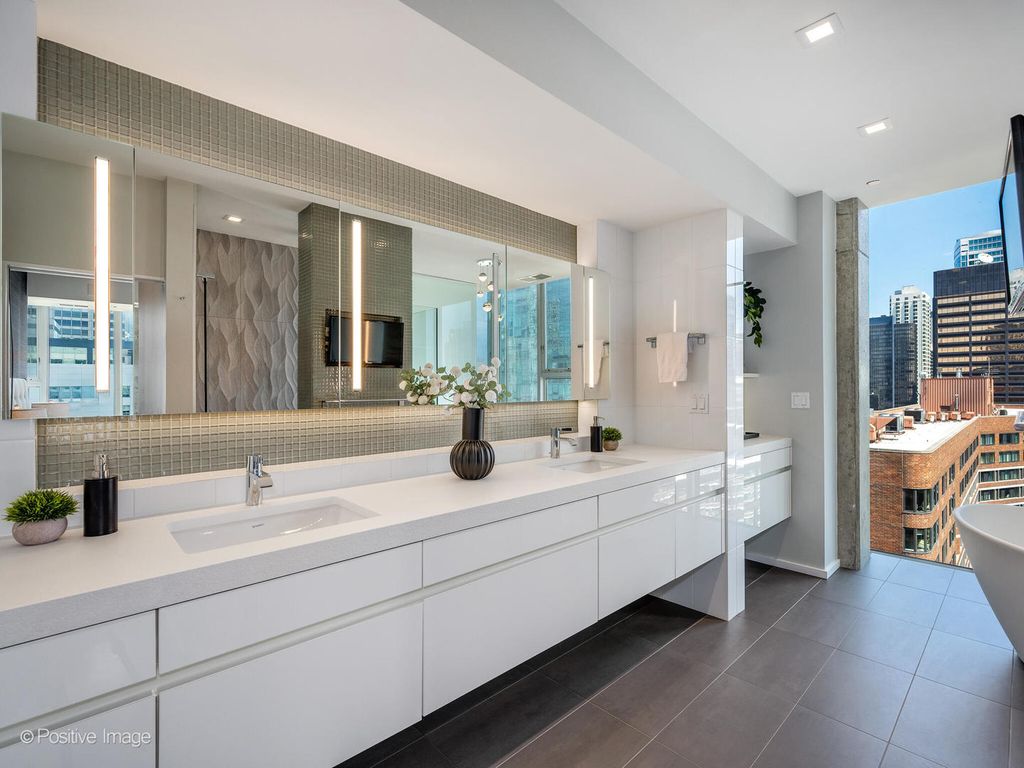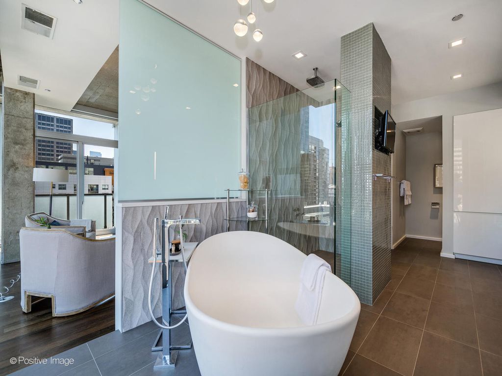 Dramatic and heavily upgraded three bedroom/three bathroom penthouse level modernist retreat in the heart of Streeterville. As you enter this home you are greeted by sweeping views from the floor to ceiling windows and 11' ceilings. A practical, yet open concept floor plan offers the feeling of a single family home and the convenience of full amenity condominium living. The formal living & dining rooms flow seamlessly to one another, anchored by a free standing fireplace and flanked by an expansive 47' terrace spanning the entire western elevation of the home. The terrace is an ideal spot to entertain and take in the sunsets and conveniently equipped with gas, water & electric. A well designed chef's kitchen offers a large large island with plenty of seating, white quartz counter tops and glass backsplash. Custom Italian cabinetry, and an impressive appliance package includes a 48' Thermador refrigerator & freezer, Wolf range/oven, Miele convection oven/steam & wine refrigerator. Two spacious guest bedrooms are en suite with stunning south facing views and light. The current owners undertook a complete reconfiguration of the master suite, creating a true sanctuary, awash with luxe finishes and a more functional plan. The new suite allows for both a sitting area and work space in addition to a second outdoor space with views of the lake and Miliienium Park and an enviable 14 X 10 dressing room/walk in closet. The spa caliber master bath is a total wow, boasting a free standing oval tub, floating double vanities plus make up vanity with pebbled quartz counter tops, heated floors, Duravit plumbing fixtures and an oversized walk in shower with Porcelanosa tile, and rain shower head. The sleek white Italian cabinetry houses incredible storage with hidden built ins. Dark-stained hardwood floors, motorized shades, contemporary lighting, custom closets & built ins throughout. Secondary access allows for a mud area with convenient access to the full laundry room with sink & cabinetry plus a separate utility room. THREE PARKING SPACES INCLUDED! Two prime, heated side by side + an additional space. Full amenity, boutique building with 24 hour door staff, indoor pool, fitness center and storage steps from Michigan Avenue.