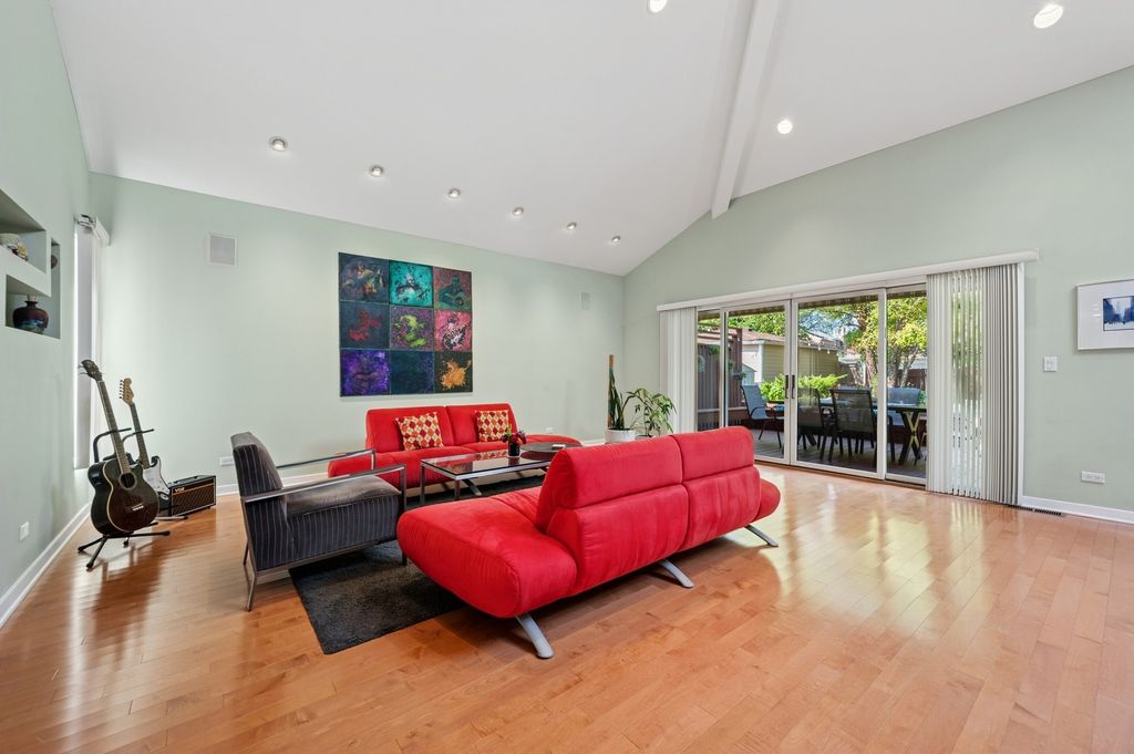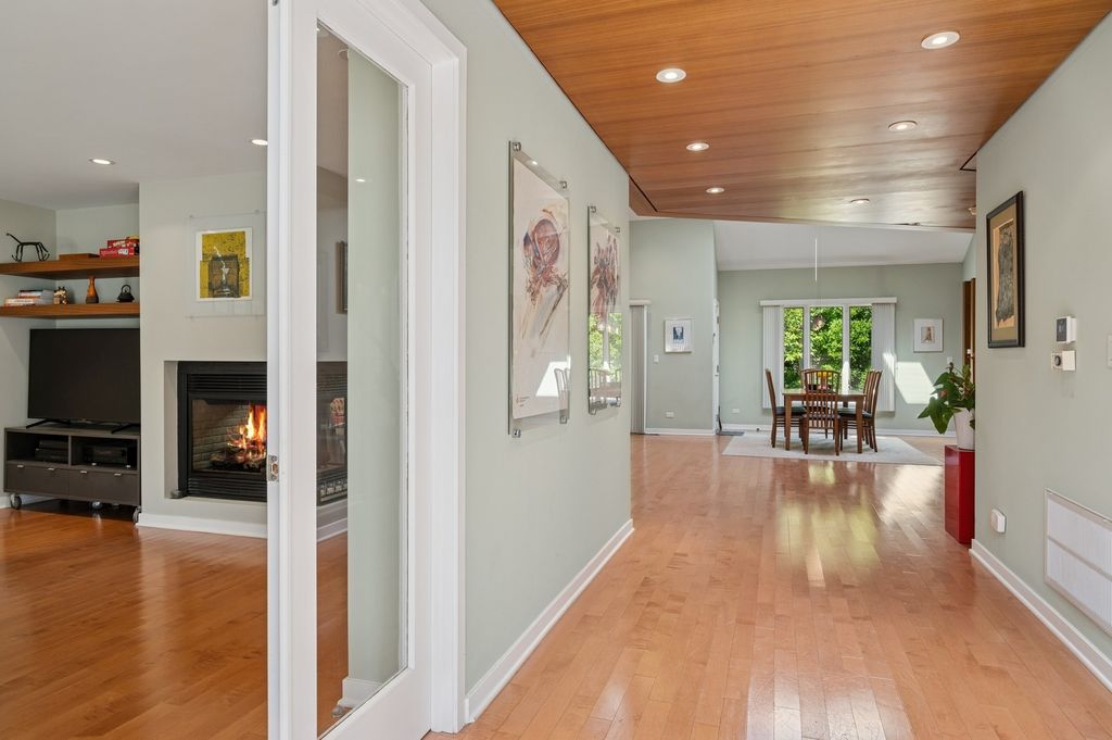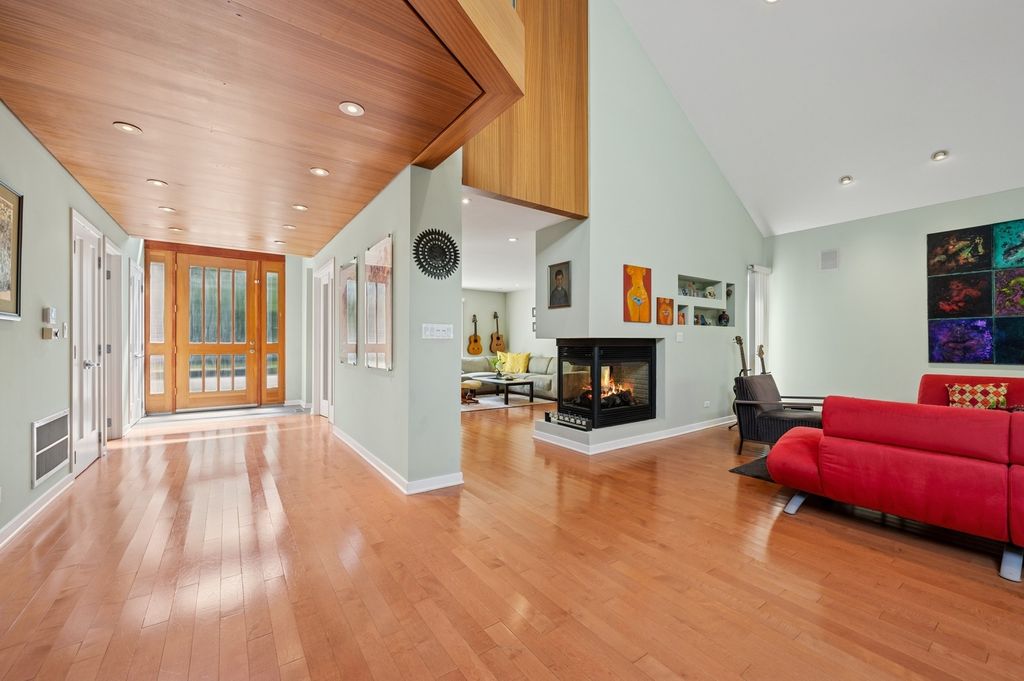 Prepare to be impressed! This stunning 4-bedroom, 3-bath custom-built home offers close to 4,000 sq ft of living space, a unique layout, and contemporary style that you won't find in a cookie-cutter design. Soaring ceilings, which reach 23 feet, abundant natural light, and beautiful hardwood flooring, create an atmosphere that's both warm and sophisticated. Custom paneling, built-in shelving, and elegant wine racks crafted from rich Sapele wood veneers add richness and character throughout the home. The main level is designed for both living and entertaining, featuring a spacious living room with a cool pass-through fireplace to the expansive family room. The geneoursly-sized kitchen has a breakfast bar and table space plus beautiful built-in shelving. This home flows effortlessly from the living room to the family room, from the kitchen to the dining area and out to a private, fully fenced double lot with a brick paver patio, deck, and retractable awning. The 4th bedroom is tucked-away on the main level with a separate entrance and beautifully remodeled hall bath, which is perfect for guests or a home office as it features a custom built-in desk and shelves. Upstairs you'll find three generously sized bedrooms, including a serene primary suite with a large bathroom featuring a separate shower and tub, plus a recently updated beautiful hall bath. Plenty of storage space throughout and all of the closets are furnished with made-to-order storage systems. Enjoy the convenience of a main-level laundry room, a detached two-car garage, a beautifully landscaped yard with architectural details, and an in-ground sprinkler system to keep it all looking its best. Located just down the street from a charming neighborhood park and a few blocks to award-winning Oliver McCracken Middle School in Skokie's sought after district 73.5. The Skokie Swift, Old Orchard Shopping Center plus all of the shops, restaurants and the incredible Farmer's Market located nearby are a huge perk of this vibrant town. This home blends privacy, convenience, and thoughtful design into one perfect package.