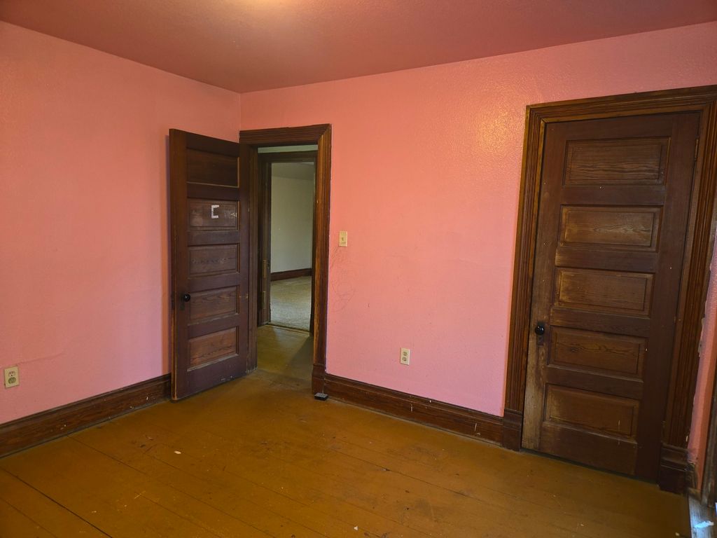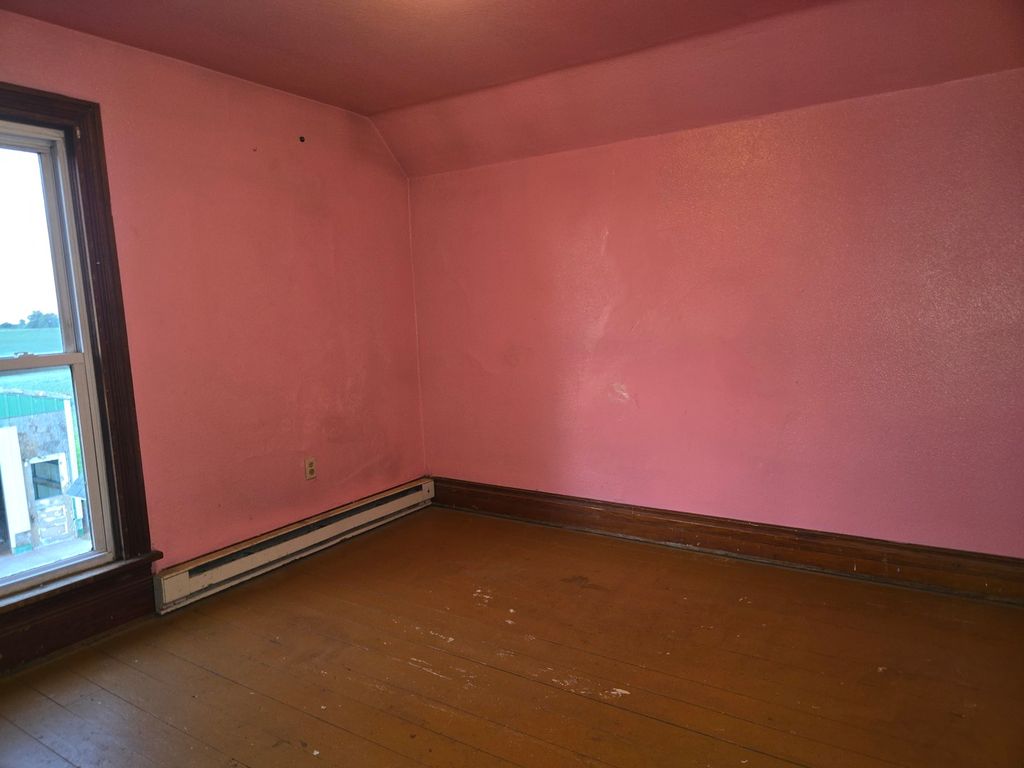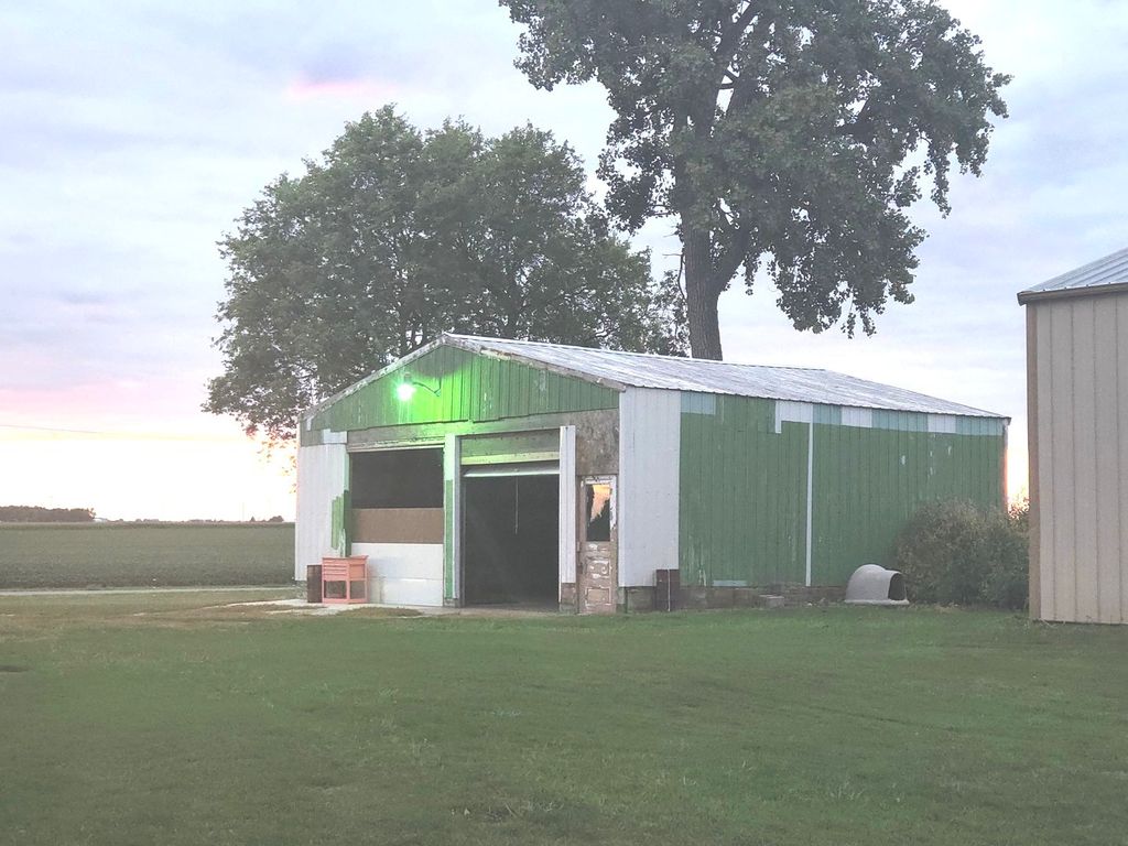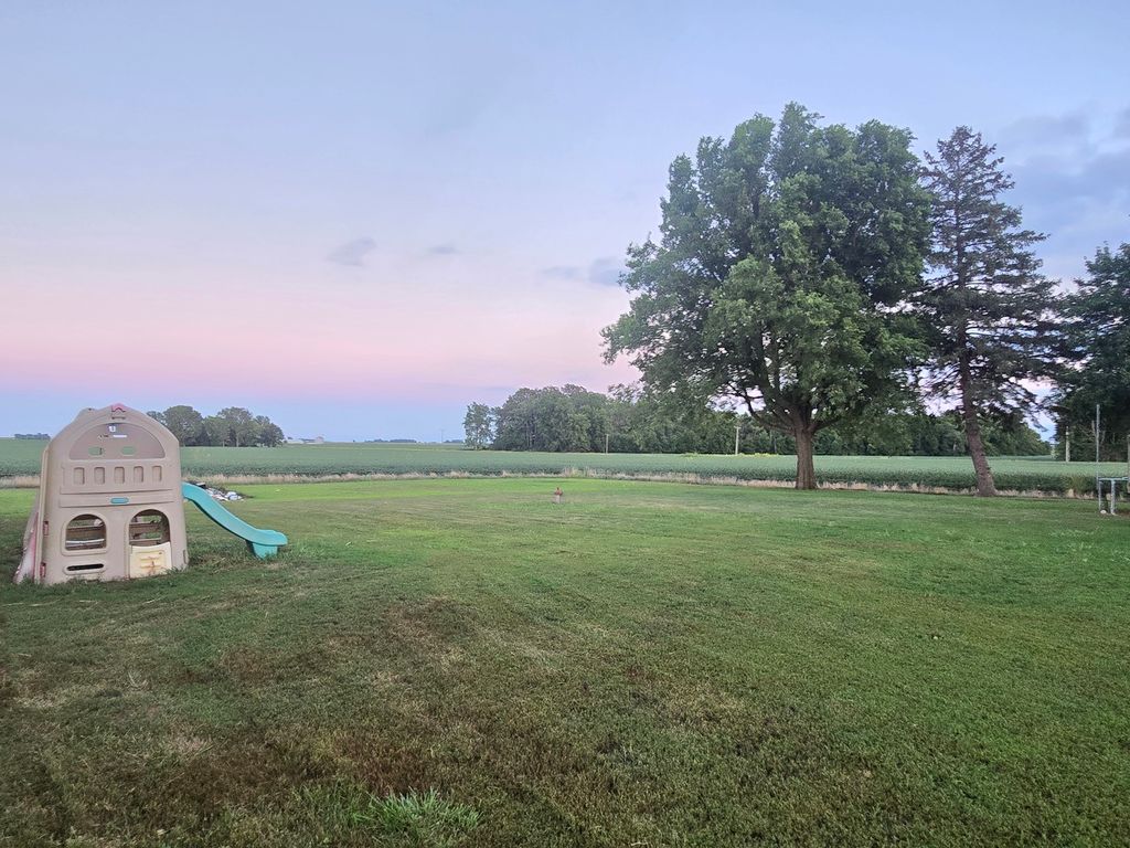 Peaceful country views and plenty of room, inside and out, in this charming 4-bedroom farmhouse! Original woodwork throughout most of the house, and you will even find a pocket door, or two. Option of setting up the master bedroom on 1st or 2nd level; all bedrooms are generous in size. Full bath on second level, half bath on main level. Enjoy sunrises from the back deck swing and take it a step further by adding a hot tub to the decorative stamped patio. Deck is fitted for approx 24' round swimming pool. Shed in NE corner of property is not included but can be purchased from landowner in separate transaction. Property sold as-is.
