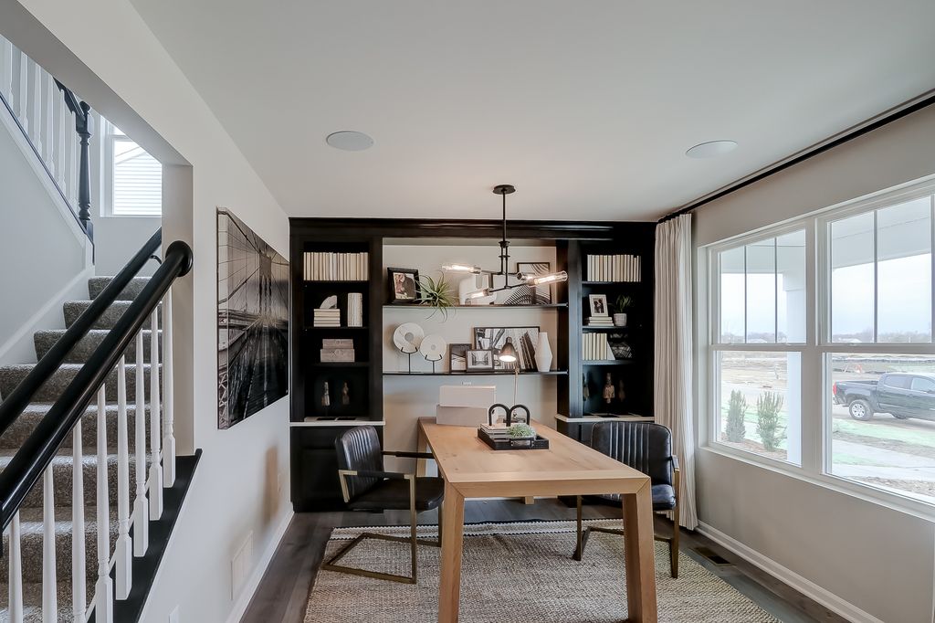 Welcome to the 2,289 square foot Quinn model in South Elgin! First, admire the grey and white vinyl exterior with black shutters and stone at the base. A tree-lined walkway will guide you up to the expansive covered porch with 3 pillars. A beautiful flex room with dark, built-in shelving sits just inside, giving you a space to set up a desk and arrange books and decor. This room is complemented by a modern lighting fixture. In the main living space straight ahead, a dining area with a black chandelier unites the kitchen and family room in one bright and open space! A white, built-in entertainment center with a mounted TV and shelving lines the side wall of this spacious family room. This room is outfitted with a sectional, wall art, an area rug, and a coffee table to tie it all together. You'll adore the kitchen in this home, which includes the following highlights: White cabinets Quartz countertops A corner pantry GE stainless steel appliances An eat-in island with cabinetry below 2 pendant lights above This model even features a morning room with vaulted ceilings! With 4 windows on the side walls and sliding glass doors to your backyard, natural light pours into this beautiful addition. Venture upstairs and into your owner's suite where you'll be greeted by a lovely, vaulted ceiling with a modern hanging light and an accent wall. This suite boasts an attached bathroom with 2 sinks on a long, white vanity. The laundry room, 3 secondary bedrooms, and another full bathroom with a 2-sink vanity round out the second floor. Rounding out this home is a 9 foot basement with a rough-in for a future bathroom. Broker must be present at clients first visit to any M/I Homes community. Lot 71 *Model home for sale. Home to close March 2026*