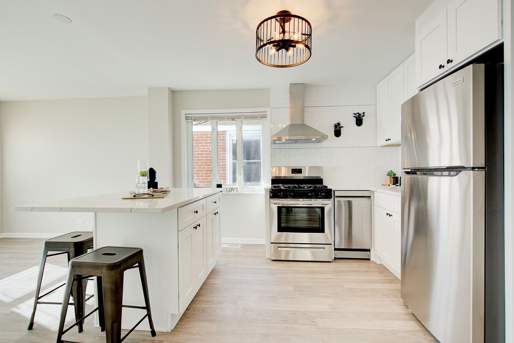 Remodeled 3bdrm, 1 bath home in Harwood Heights. Great, fully updated starter home. New roof, new floors on first level, new carpet on second level, new kitchen, new bath, detached 1 car garage with alley entrance, great back yard. Amazing school system with Pennoyer & Maine South High School, amicable and quiet neighborhood right near I-90 and Blue line CTA for an easy access to the city and Downtown and O'Hare. Near parks, schools, restaurants, shopping. Low property taxes does not reflect on a homeowners exemptions.