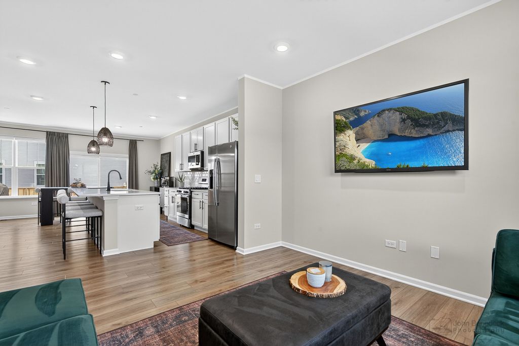 Stunning, like-new 2-Bed/2.5-Bath tri-level townhome in the highly sought-after Crossings of Mundelein! This home is truly move-in ready. The main level features a large, bright open concept layout with lots of natural light, a cozy living room, chef's kitchen and a dining room/flex room. The kitchen is a showstopper with a large island with breakfast bar, all white cabinets, SS appliances and ample counter space. Sliding doors from the dining/flex room lead out to your private balcony, perfect for relaxing or entertaining. You'll love the upscale finishes, including beautiful LVP flooring and recessed lighting throughout the main level. Upstairs, you'll find two spacious bedrooms, each with its own en-suite bath. The primary suite includes a large walk-in closet for added convenience. A 2nd floor laundry area and ample closet/storage space add to the functionality. The lower level provides even MORE living space with a rec room perfect for a home gym, office, family room or even a guest room. Upgrades to this home include SW paint, soft-close hinges, coating on garage floor, upgraded ceilings lights and so much more. Attached 2-car garage. All of this plus serene views of the neighborhood pond and park. Conveniently located near shopping, dining, top-rated schools, and entertainment, all while being set in a peaceful, country-like setting. You truly don't want to miss this one - schedule your tour today!