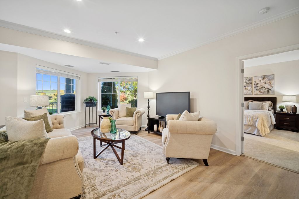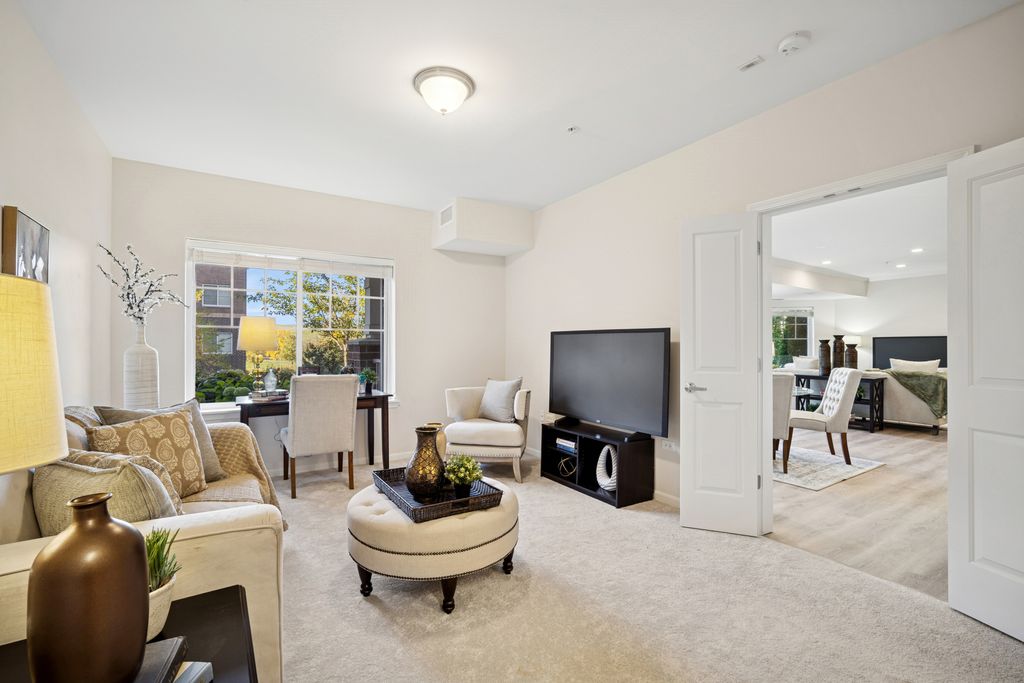 MOTIVATED ESTATE SALE-A RARE opportunity at the Lodge of Northbrook (55+ community). This light-filled 2 BR/2 BA residence offers fresh updates, beautiful features, comfortable living and strong investment value. The Lodge entrance fee is $435,025. The seller is offering a $61,025 cash rebate at closing bringing your effective cost to $374,000. PLUS, enjoy the lower monthly assessment cost per square foot compared to other Lodge units. This move-in ready home features brand new flooring throughout; two en suite bedrooms with large walk-in closets; an open-concept great room; and full kitchen. The great room is versatile for dining, office, den or entertaining. The kitchen includes a large granite island for cooking or dining at home with a meal from the Lodge's executive chef or on-site bistro. Each bathroom has a roomy walk-in shower and full linen storage. Wall-to-wall windows fill the home with natural light throughout the seasons. The private covered patio boasts STUNNING VIEWS of gardens, daily sunsets and the "golf course on the hill." Unit amenities include a large in-unit laundry, heated garage parking and a generously sized storage room. First-floor living provides easy access to mail, dining, concierge and daily activities-plus pet-friendly convenience. The LODGE OF NORTHBROOK offers an enriching independent 55+ lifestyle with on-site dining, free local transportation, a wellness center, beauty salon, library, and community gathering spaces (both indoor and out). The dedicated lifestyle director organizes workshops, fitness classes, hobby clubs and activities as well as outings to vibrant Northbrook and North Shore locations. Monthly assessments cover PROPERTY TAXES, common insurance, utilities, internet, maintenance and weekday continental breakfast. Visit the Lodge of Northbrook website for more information. Income qualification required. Spend some time with this unit's photos then come for a showing of this rare opportunity!