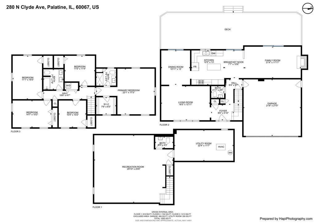 Welcome to your dream home in Palatine, IL! Within the highly rated and sought after District 15 schools and FREMD High School! This custom-built residence offers an exceptional blend of style, comfort, and functionality, boasting 5 spacious bedrooms, 2 full bathrooms and 2 half bathrooms. The freshly painted interiors provide a bright and welcoming atmosphere, ready for you to move right in. The gourmet kitchen has been beautifully updated with brand new appliances and granite countertops, while both full bathrooms have been meticulously updated, offering a luxurious touch to your daily routine. Each bedroom is generously sized with ample closet space, ensuring comfort and convenience for every family member. Enjoy a cozy, truly homey feeling enhanced by a warm fireplace. Venture to the fully finished basement, which offers endless possibilities with a roughed-in area for a wet bar and a convenient half bathroom, making it perfect for hosting gatherings, game nights, or simply relaxing. Entertain friends and family on the expansive deck that overlooks a large yard, providing plenty of space for outdoor activities. The property's 2.5 car garage is a standout feature, heated and with epoxy flooring, ideal for any car enthusiast. In the backyard, the custom-built giant shed is a homeowner's delight, equipped with electricity, double-wide doors for easy access, and a huge loft area for additional storage - perfect for all your tools and toys. This magnificent home is in move-in ready condition and eagerly awaits its new owners. Don't miss this rare opportunity to own a piece of Palatine's finest real estate!