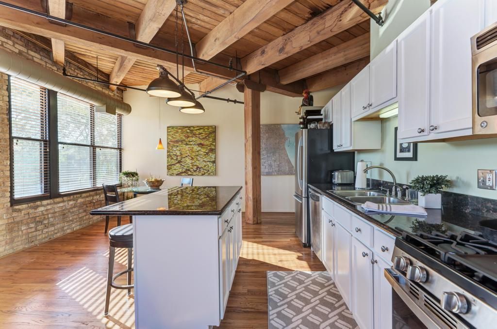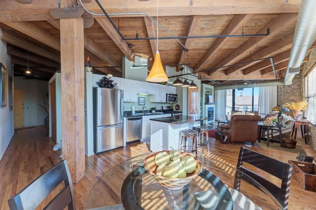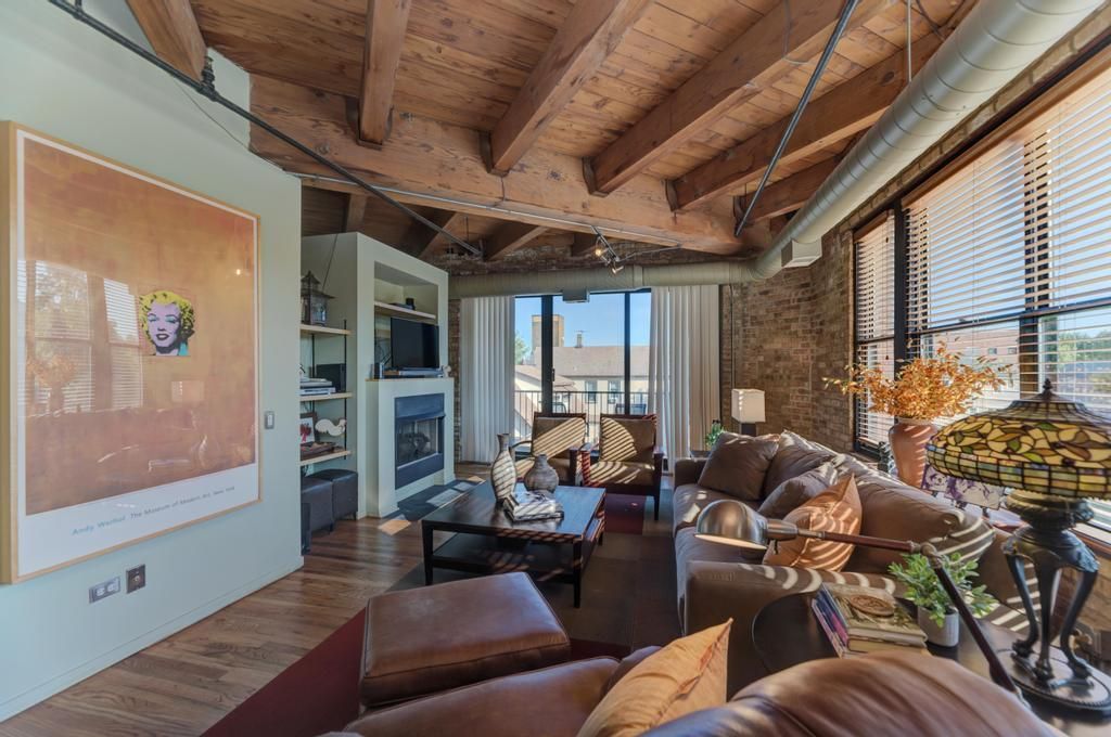This fantastic corner loft seamlessly blends industrial charm with modern updates, featuring soaring timber ceilings, exposed brick walls, and two walls of oversized windows that flood the space with natural light. Refinished hardwood floors (2025) flow throughout, creating an open, airy feel. A private balcony is perfect for summer evenings, while the gas fireplace with ceramic logs offers a cozy retreat in winter. The recently updated kitchen showcases white cabinetry, granite countertops, and stainless steel appliances. The primary bath, fully renovated in 2025, features a white vanity with quartz counters and a sleek white-tiled shower and flooring. Additional conveniences include in-unit laundry, a newer furnace, an attached heated garage space, and the ease of an elevator building. Ideally located near the Blue Line, 606 trail, and the restaurants and nightlife of Logan Square. Stunning unit you won't want to miss!