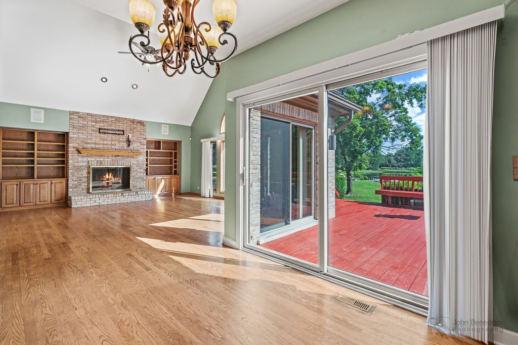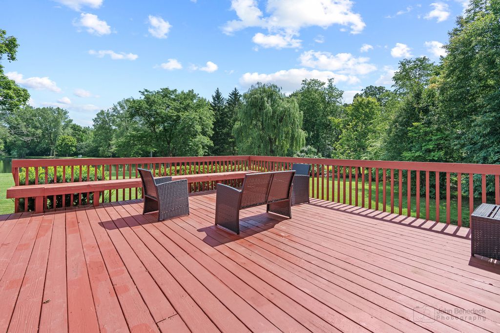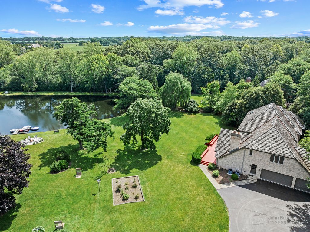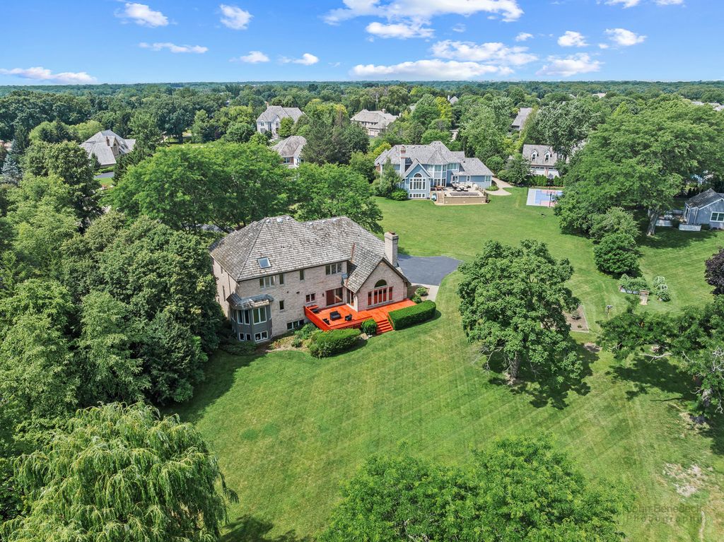 This All Brick Orren Pickell Built home in sought after Nickels and Dimes is nestled on 1.19 acres in a quiet cul-de-sac with serene pond views. This stately all-brick residence is served by award-winning Oak Grove K-8 and nationally ranked Libertyville High School. As you enter you'll notice the soaring two-story foyer flanked on each side by a formal living and formal dining room. The formal living room has designer carpet, built-in cabinetry and french doors that lead to a private office with bowed windows which offers inspiring views of the backyard and pond, and also functions perfectly as a guest or in-law bedroom. Remaining flooring on the main level is hardwood. Designed for the culinary enthusiast, the eat-in kitchen boasts stainless steel appliances, granite countertops, an oversized island, and ample counter and cabinet space-ideal for everyday living and entertaining alike. The adjacent family room is a showstopper, anchored by a dramatic two-story stone fireplace and vaulted ceilings, while custom built-in bookcases add sophistication and charm. Both the kitchen and family room have sliders leading to an expansive deck again overlooking the large backyard and pond. A large powder room, well-appointed mudroom/laundry with direct exterior access, and access to the 3 car garage completes the main level. Upstairs, the luxurious primary suite is a true retreat, complete with dual walk-in closets, a sunlit sitting area overlooking the front yard, and a spa-like ensuite bath features, dual vanities, a jetted soaking tub, walk-in shower with seat, and private water closet. An additional generously sized bedroom also offers ensuite accommodations, while two more spacious bedrooms share a hall bath. All bedrooms include generous closet space. The fully finished English basement offers an additional 2,035sf, a 5th bedroom, full bath and another flex space that was used as a theater room or change it to an in home gym. Outdoor living is equally impressive. A sprawling deck overlooks lush landscaping and tranquil pond views, while the in-ground sprinkler system keeps the grounds pristine. Additional features include an oversized 3-car garage, dual-zone HVAC, gas line for grill and proximity to scenic Forest Preserve Trails and I-94.
