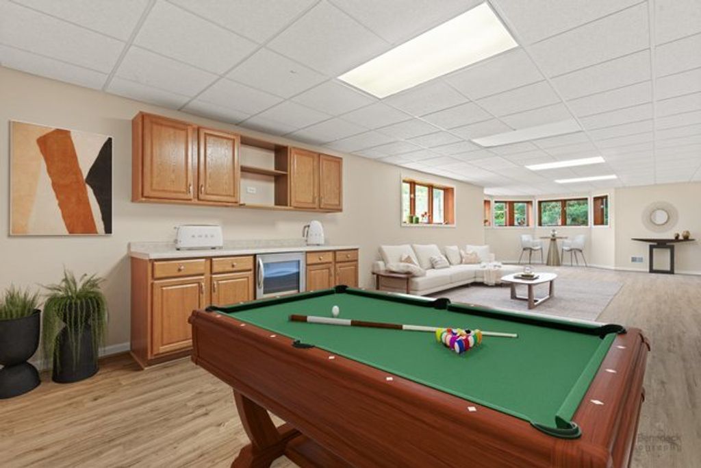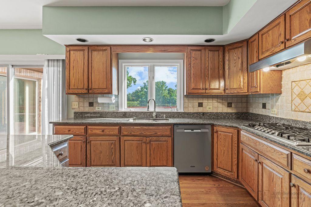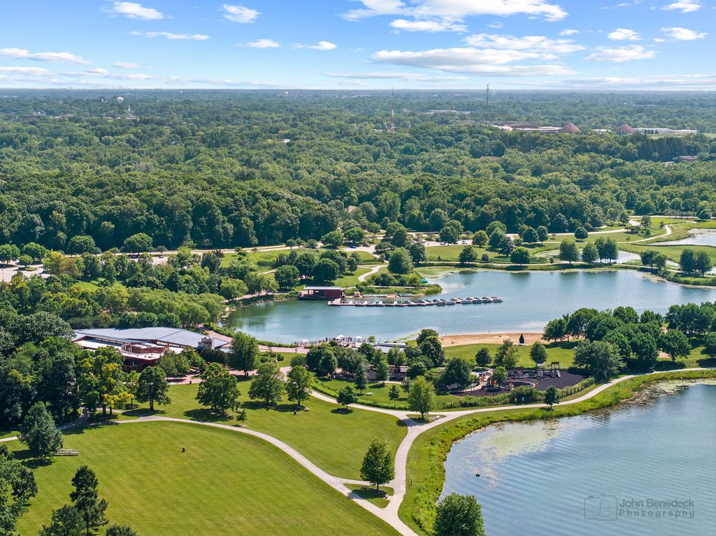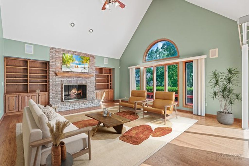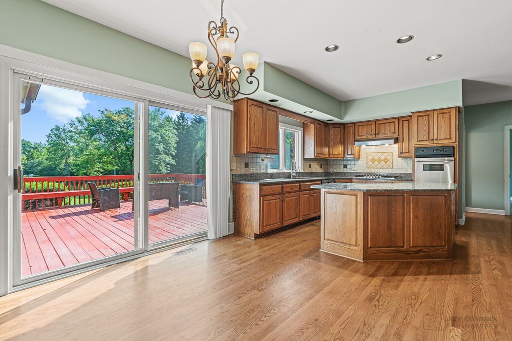 This All Brick Orren Pickell Built home in sought after Nickels and Dimes is nestled on 1.19 acres in a quiet cul-de-sac with serene pond views. This stately all-brick residence is served by award-winning Oak Grove K-8 and nationally ranked Libertyville High School. As you enter you'll notice the soaring two-story foyer flanked on each side by a formal living and formal dining room. The formal living room has designer carpet, built-in cabinetry and french doors that lead to a private office with bowed windows which offers inspiring views of the backyard and pond, and also functions perfectly as a guest or in-law bedroom. Remaining flooring on the main level is hardwood. Designed for the culinary enthusiast, the eat-in kitchen boasts stainless steel appliances, granite countertops, an oversized island, and ample counter and cabinet space-ideal for everyday living and entertaining alike. The adjacent family room is a showstopper, anchored by a dramatic two-story stone fireplace and vaulted ceilings, while custom built-in bookcases add sophistication and charm. Both the kitchen and family room have sliders leading to an expansive deck again overlooking the large backyard and pond. A large powder room, well-appointed mudroom/laundry with direct exterior access, and access to the 3 car garage completes the main level. Upstairs, the luxurious primary suite is a true retreat, complete with dual walk-in closets, a sunlit sitting area overlooking the front yard, and a spa-like ensuite bath features, dual vanities, a jetted soaking tub, walk-in shower with seat, and private water closet. An additional generously sized bedroom also offers ensuite accommodations, while two more spacious bedrooms share a hall bath. All bedrooms include generous closet space. The fully finished English basement offers an additional 2,035sf, a 5th bedroom, full bath and another flex space that was used as a theater room or change it to an in home gym. Outdoor living is equally impressive. A sprawling deck overlooks lush landscaping and tranquil pond views, while the in-ground sprinkler system keeps the grounds pristine. Additional features include an oversized 3-car garage, dual-zone HVAC, gas line for grill and proximity to scenic Forest Preserve Trails and I-94.