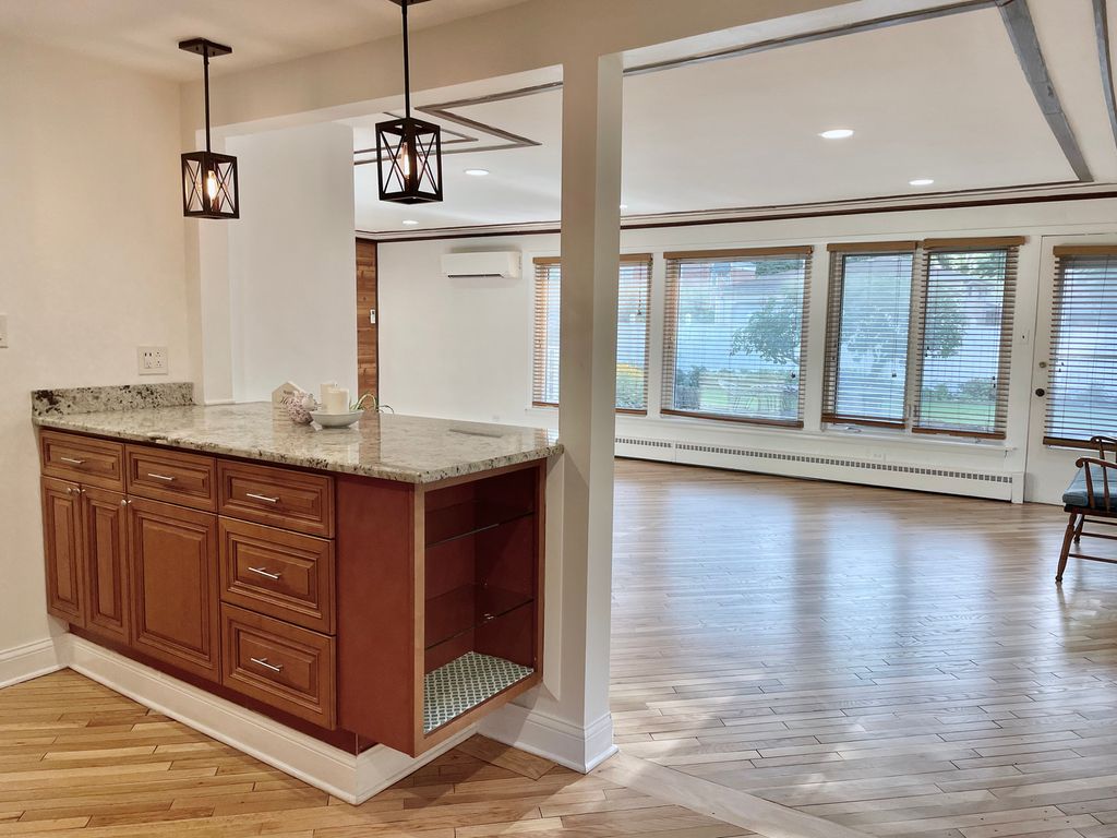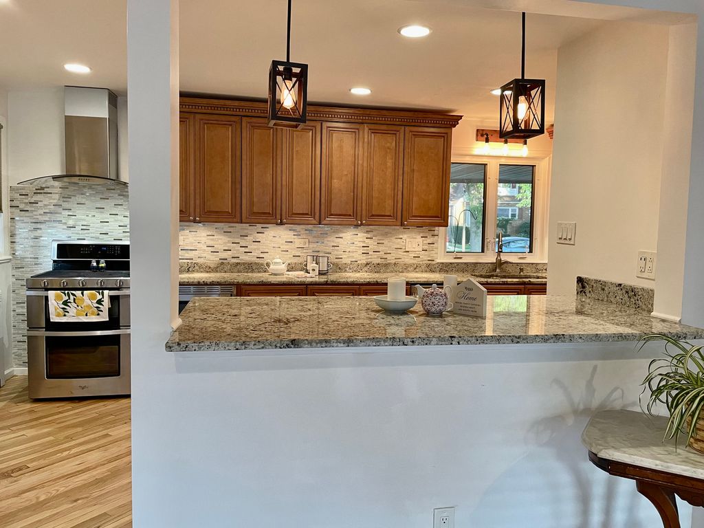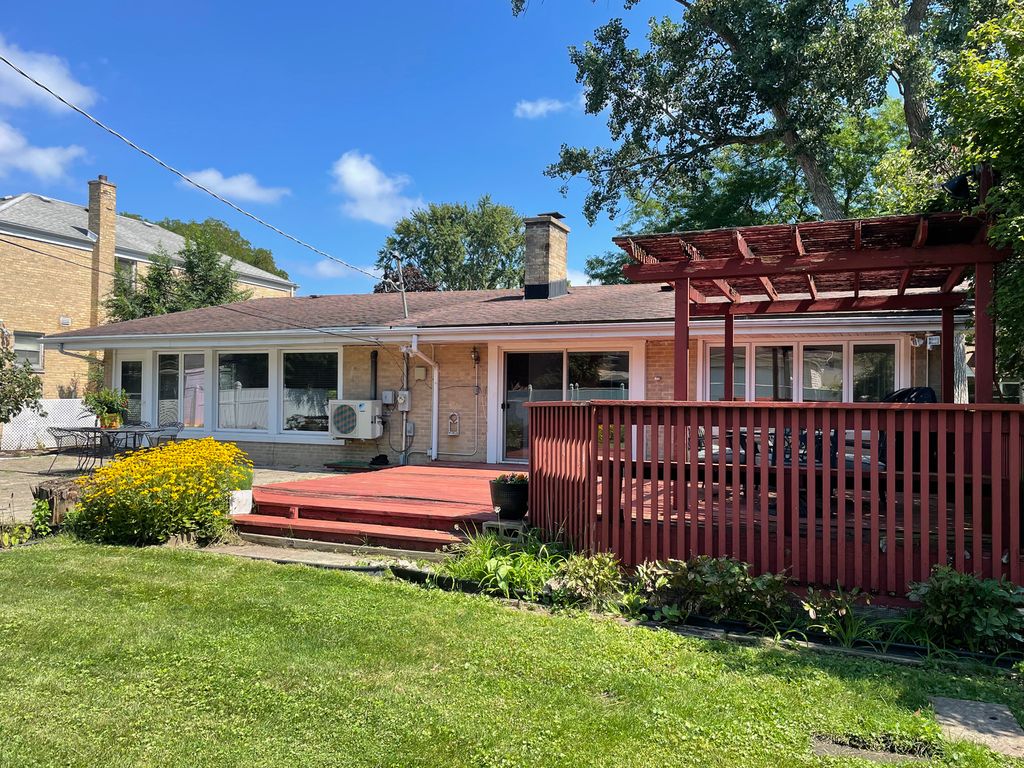 Sprawling three-bedroom, all-brick ranch boasts a double-door entry with attractive, clear stained-glass doors, welcomes you into the spacious foyer. The open floor plan flows from the front foyer into the combined living and dining room with a wood-burning fireplace, eye-appealing hardwood floors set on a diagonal. The combined living room and dining room are beautifully illuminated by natural sunlight from the two walls of oversized windows. Step into the fully updated modern kitchen with stylish wood cabinets, granite counters, stainless steel appliances, complete with a breakfast bar. Freshly painted neutral walls await your decorating tastes. The home offers three updated bathrooms, one located in the privacy of the master bedroom, one in the hallway, and one conveniently located in the finished basement. The basement includes a ceramic tiled recreation room with bookshelves, multiple storage closets, a storage room, plus a large laundry room. Home benefits from a double-wide lot providing a spacious backyard with a wood deck & pergola (needs a little TLC), paver stone patio, garden space, absolutely perfect for all your outdoor activities. Time to call this gem your home!