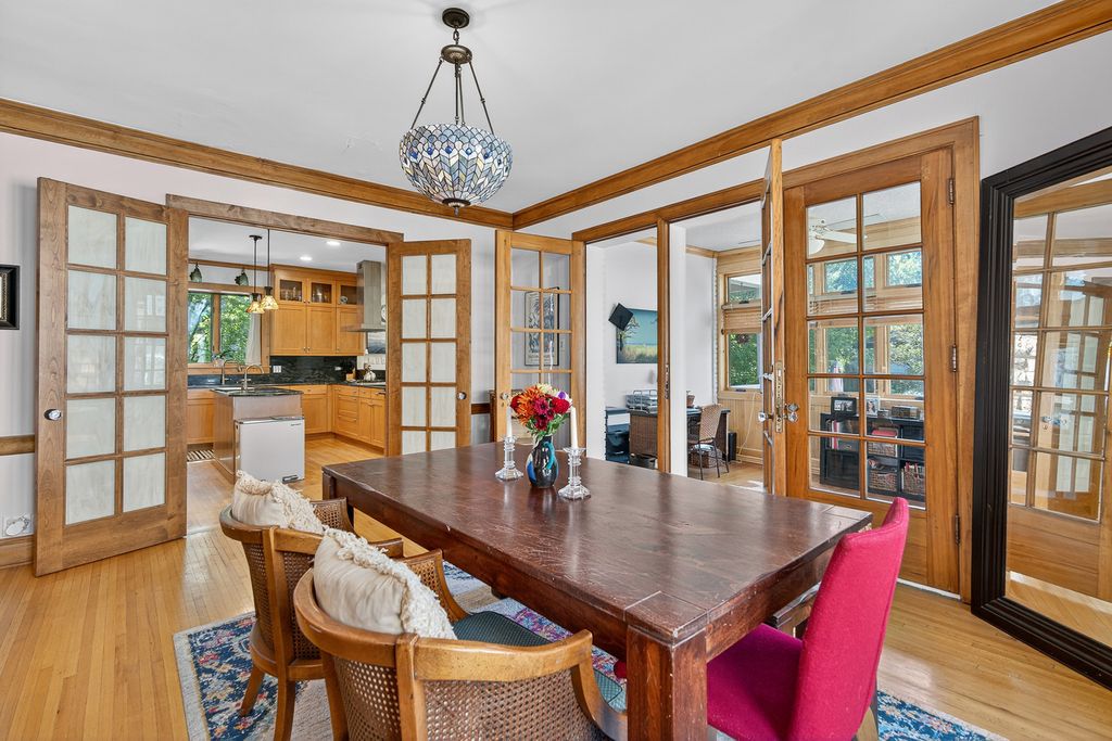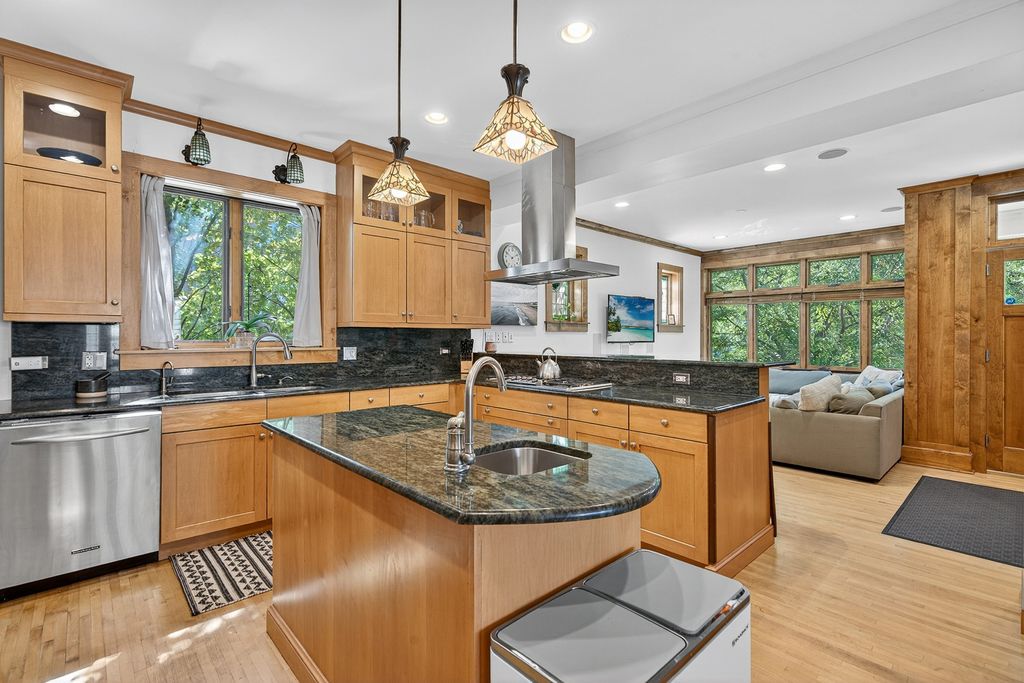 Discover this gorgeous extra-wide brick home on a premier tree lined cul-de-sac street in Sheridan Park. The home sits on an estate-like 50x154 lot, complete with a beautifully landscaped front yard and a gracious formal foyer that preserves its original vintage details, such as stained glass windows and classic woodwork. The main level is designed for both comfort and entertaining. The professional kitchen features Thermador and Kitchenaid appliances and a large island with a breakfast bar that flows seamlessly into separate dining and family rooms. This level also includes a convenient covered side entrance and is serviced by dual-zoned HVAC for optimal climate control. The second floor features three bedrooms and two full bathrooms. The primary suite offers a roomy walk-in closet, a private roof deck, and a bathroom equipped with a steam shower. The radiant-heated lower level provides another full bathroom, laundry room, and potential for additional living space. Abundant storage and closet space are found throughout the home. Exterior amenities include multiple outdoor spaces, highlighted by a beautifully landscaped and irrigated backyard perfect for relaxation or gatherings. Parking is plentiful, with an oversized two-car garage that includes a large workshop and additional storage, plus an adjacent parking pad for a third vehicle. The location offers easy access to the lakefront, the Broadway entertainment district, and public transit.