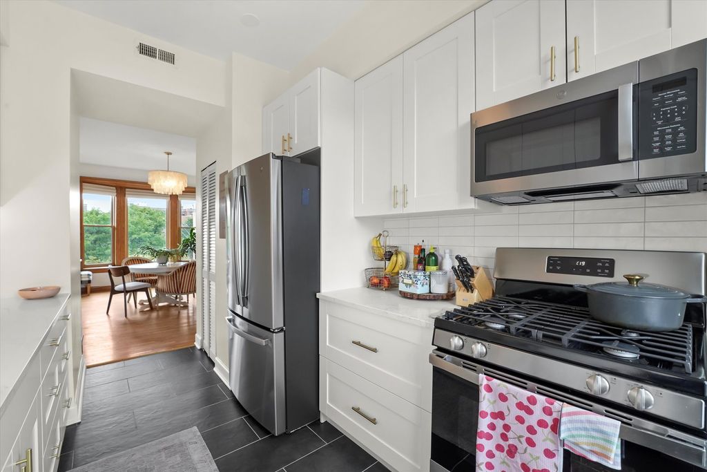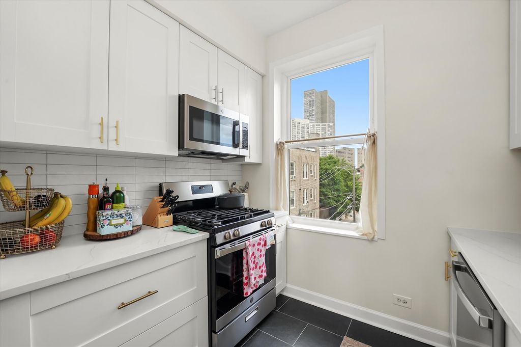 **OH CANCELLED** This charming and updated top-floor 2 bedroom condo in the heart of the East Lakeview neighborhood offers a perfect blend of vintage charm and modern updates! Situated on a quiet, tree-lined street with bright east/west exposure, the spacious condo is flooded with natural light from its grand wall of windows, creating a welcoming atmosphere throughout. The open-concept living and dining areas feature beautiful hardwood floors, a cozy wood-burning fireplace, and custom built-ins & storage cabinets, creating an inviting space perfect for entertaining. The recently renovated kitchen is a chef's dream, with stunning new stone countertops, sleek tile flooring, a striking tile backsplash, and newer stainless steel appliances, all complemented by ample cabinet space for storage. The spacious primary bedroom features two closets for plenty of storage, while the second bedroom, complete with a custom Murphy bed, is perfect for use as an office or guest room. The updated bathroom is fresh and inviting, with light tile, a bathtub, and a shower for a clean, modern look. Recent updates include custom Roman shades and updated windows throughout, enhancing both the style and energy efficiency of the home. For added convenience, the unit comes with an in-unit washer and dryer, central air conditioning, and a secure locked storage unit in the basement. Step outside to your private back porch, perfect for grilling, or head up to the shared rooftop deck, where you'll enjoy stunning city views, including a glimpse of Wrigley Field. Zoned parking is available right in front of the building. Located just steps from the Sheridan Red Line stop and the 151 bus route, this prime location offers easy access to downtown. Short stroll to the lakefront path, Waveland Park, and Montrose Beach, plus close proximity to popular restaurants and shops on Sheridan, Irving Park, Broadway, and Clark Street. The self-managed, investor-friendly building boasts high owner occupancy and is perfect for those seeking both comfort and convenience in one of Chicago's most desirable neighborhoods!