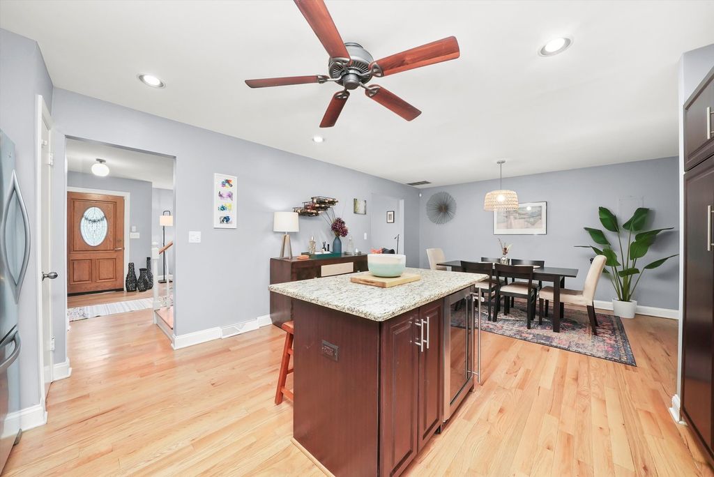 Welcome to this stunning, sun-drenched 4-bedroom, 3-bathroom home perfectly situated in the heart of Lombard-just steps from Lombard Lagoon, Schafer Elementary, the Metra station, shopping, dining, and more! Step inside to find a meticulously maintained interior featuring an open and airy living room filled with natural light, large windows, and beautiful oak hardwood floors (installed in 2018). The kitchen is an entertainer's dream, offering a spacious island, stainless steel appliances (including a new dishwasher added in 2022), granite countertops, a wine fridge, abundant storage, and a separate dining area. Just off the kitchen, enjoy a fully screened porch-ideal for year-round gatherings. The main level also features a convenient laundry room and three spacious bedrooms, including one that can serve as a first-floor primary suite complete with a private en-suite bath. This level also boasts remodeled bathrooms with updated floor and wall tile, fixtures, and lighting-all completed in 2018-along with upgraded decorative lighting throughout (2022), a new furnace (2019), and a new AC unit (2019). Upstairs, you'll find a truly special primary suite featuring an en-suite bathroom, a walk-in closet, and a sprawling walk-out deck that overlooks the fully fenced backyard. This flexible space could otherwise be used for a guest suite, home office, gym, or bonus living area-the possibilities are endless. The second floor is also equipped with a new AC unit (installed in 2022). Just in time for summer, the beautifully landscaped backyard offers the ultimate outdoor retreat with ample space to relax, dine al fresco on the deck, or host gatherings in the expansive yard. Recent exterior enhancements include new gutters with guards (2022) and a fully sealed, insulated attic and solar fan (2022). This move-in-ready gem has it all-style, space, and an unbeatable location. Don't miss your chance to live in the center of it all in Lombard!