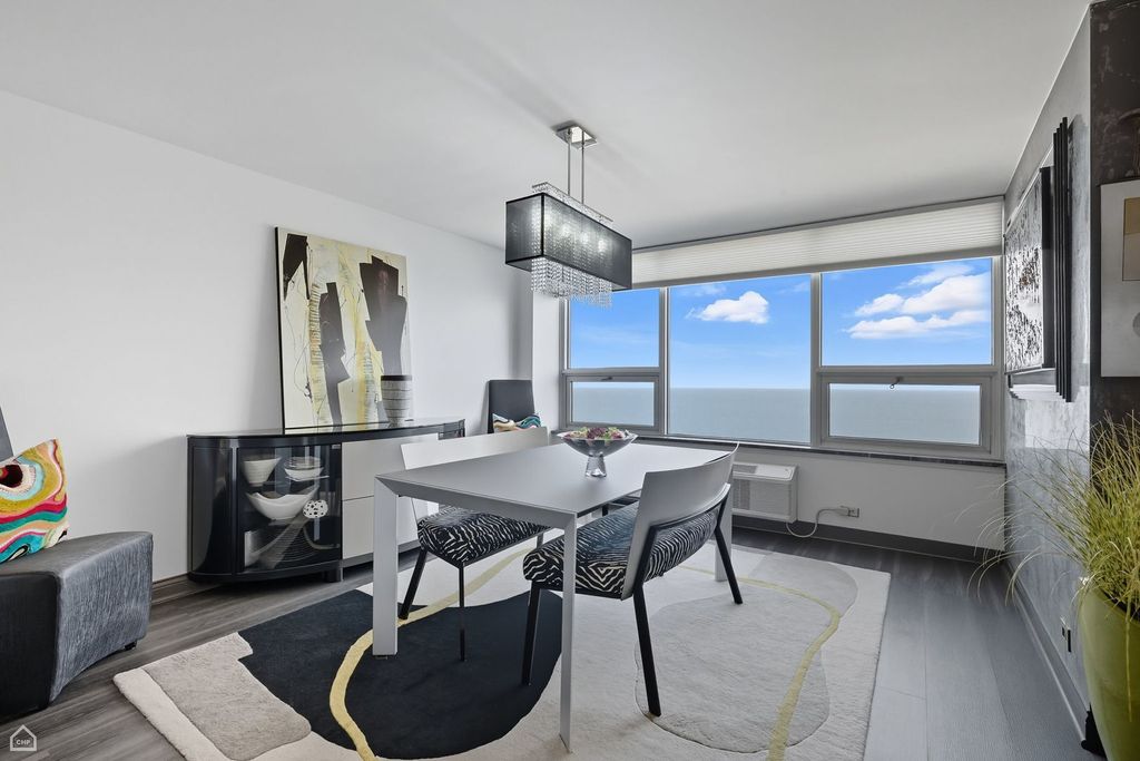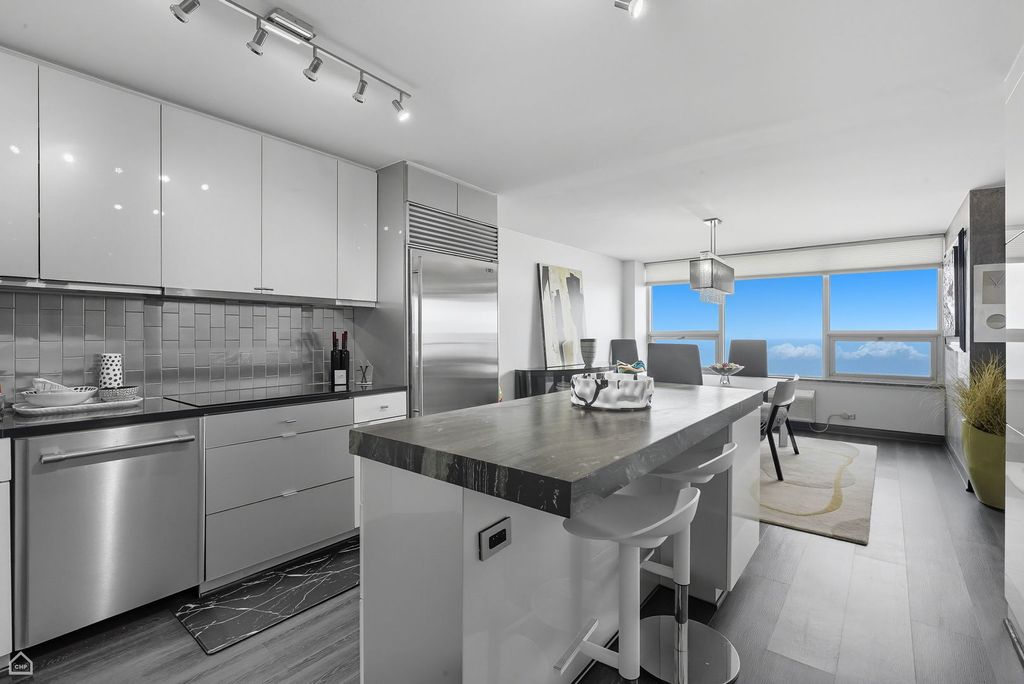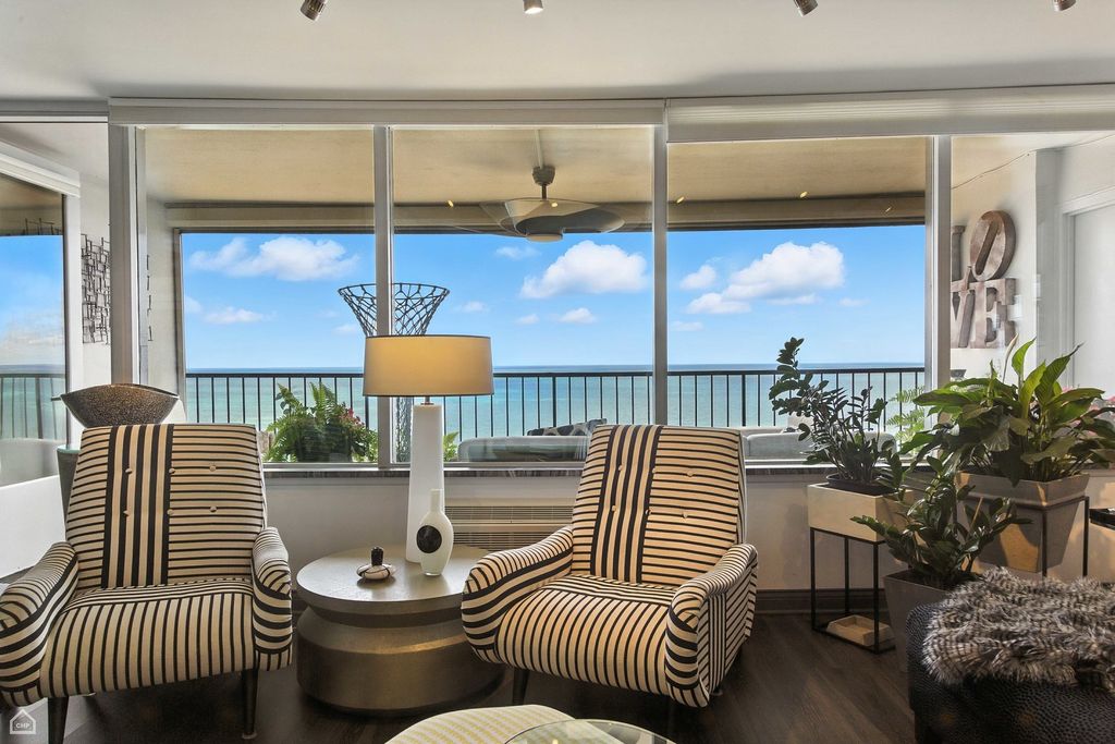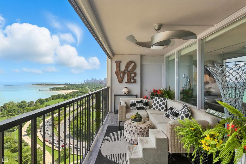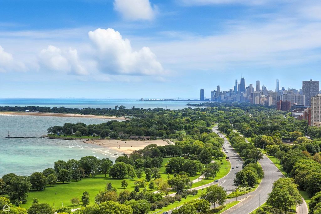 Welcome to one of the most unique homes on the lakefront - a rarely available D-Tier in the iconic Horizon House. This building sits parallel to the shoreline, giving you a front-row seat to sunrises over Lake Michigan and sunsets over the city. This spacious condo, approximately 2,000 sq. ft., features 3 bedrooms and 2 bathrooms and has been thoughtfully updated with a bold, designer touch. The open living space feels like a curated gallery, filled with light and personality. The kitchen is both stylish and functional, with glossy cabinetry, a waterfall-edge island, stainless steel appliances, and a statement backsplash that ties it all together. Step outside to the oversized, covered balcony with a retractable screen - it serves as more of an outdoor living room, complete with a ceiling fan, lush plants, and ample space to lounge. Inside, each room has its own unique vibe. The primary suite feels like a boutique hotel, featuring a renovated bathroom and plenty of closet space. The other two bedrooms offer flexibility for guests, an office, or a creative space - all with great natural light and stunning west views. You'll also appreciate the in-unit laundry room, equipped with a full-size washer and dryer, and a utility sink. Building amenities include a rooftop pool, two fitness rooms, on-site parking, 24-hour door staff, and direct access to the beach and lakefront trail right from the lobby. Plus, you're just blocks away from Mariano's, Whole Foods, the Red Line, and all the vibrant energy of Andersonville and Edgewater. Homes like this don't come around often- this one is truly something special.