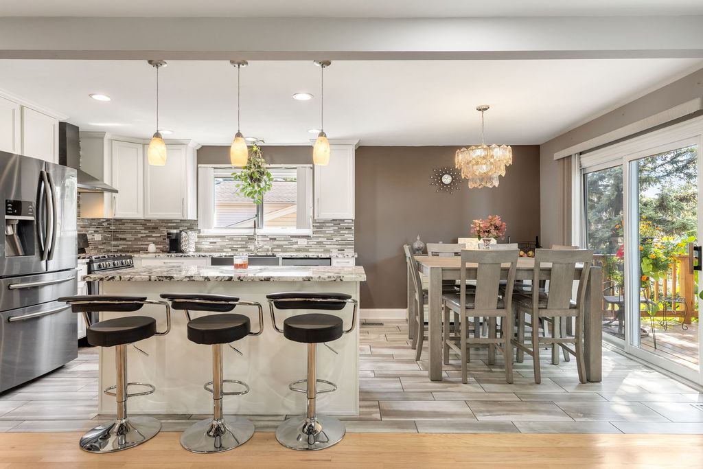 Welcome to this stunning T-Raised Ranch, where style and comfort come together! Approx.. 2184 S.F. Step inside and be greeted by elegant new railings with wrought-iron spindles and a beautifully refinished wood staircase. The open-concept floor plan leads you into the new gourmet kitchen. This dream kitchen features a large granite center island with modern pendant lighting-perfect for entertaining. Enjoy cooking on the 5-burner range with a sleek black stainless steel vent hood, surrounded by custom white cabinetry, granite counters tops, a farmhouse sink with designer fixtures, a stylish tile backsplash, and black stainless steel appliances. Designer tile flooring completes the look, creating a space that is both functional and luxurious. The bright dining area opens to the newer deck-ideal for outdoor dining or relaxing with views of the beautifully landscaped backyard filled with trees and flowers. Professional landscaping also enhances the front and sides of the home. Freshly painted rooms, refinished hardwood floors in the living room, and new laminate flooring in the main-level bedrooms provide a move-in-ready feel. The lower level offers incredible space for everyone, featuring a large family room with a cozy brick fireplace and built-in bookcases. A fourth bedroom, updated full bathroom, and additional areas for dining, play, or office use make this level perfect for guests or in-laws. Storage is never a concern with the oversized garage, complete with built-in cabinets, shelving units, a workbench, and a service door to the yard. Brand-new roof in 2023 Located in the highly desirable School Districts 89 and 87, this home offers easy access to expressways, the Lombard Metra station, Yorktown Mall, shopping, parks, and schools. This is truly a wonderful place to call home!