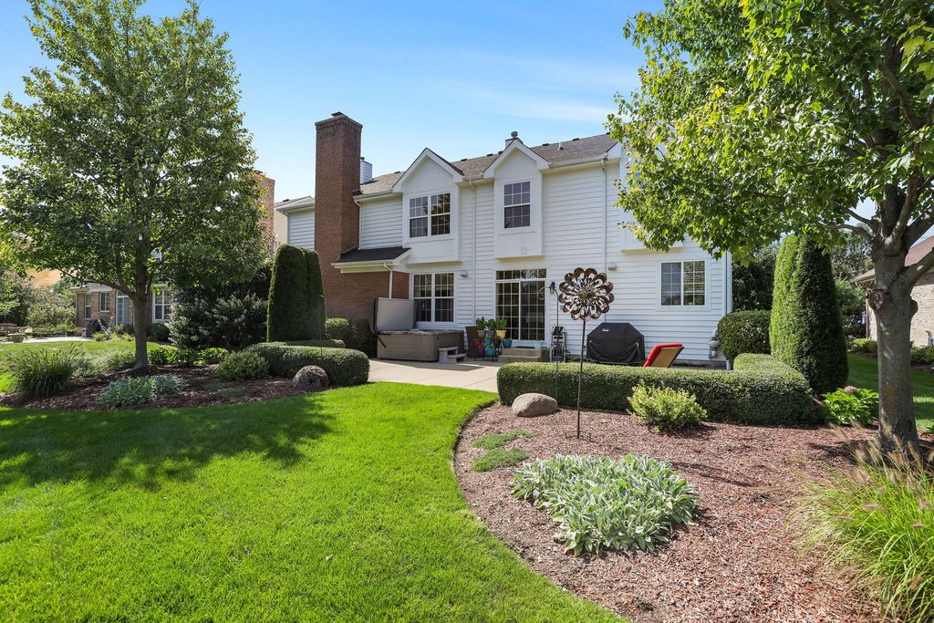 Located in the desirable Gregg's Landing subdivision, this spacious and well-maintained home offers 5 bedrooms and 3.5 baths, including a private en-suite in the finished basement. The main level features fresh paint and a thoughtfully designed layout with formal living and dining rooms, ideal for both everyday living and entertaining. A private office off the den provides a quiet space for work or study. The kitchen is equipped with stainless steel appliances, complemented by ample cabinetry and counter space. Two staircases lead to four generously sized bedrooms upstairs, offering comfort and flexibility for a variety of lifestyles. The finished L-shaped basement adds valuable living space, featuring a full-size refrigerator, wet bar, and an adjacent en-suite bedroom. The remaining space is versatile-perfect for entertaining, exercise, play, or hobbies. Step outside to enjoy a beautifully landscaped, private backyard complete with a relaxing hot tub-ideal for outdoor gatherings or quiet evenings. Located within the Vernon Hills High School district, the neighborhood offers a perfect balance of convenience and community, with nearby parks for outdoor activities and easy access to shopping, dining, and everyday essentials.