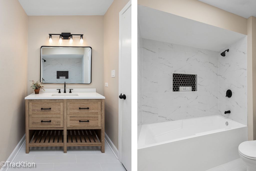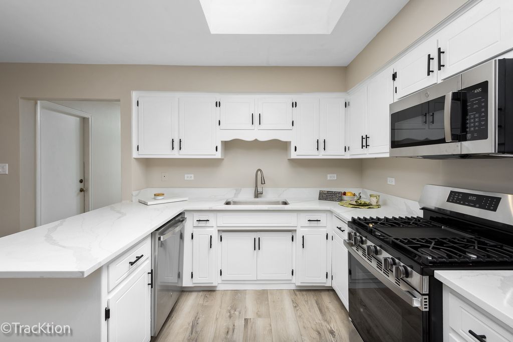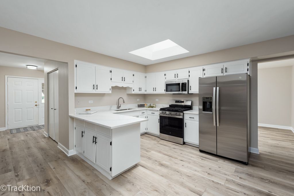 Beautifully updated step ranch ready to move right in! The main level features fresh paint, wood laminate flooring, and new light fixtures throughout. The bright white kitchen offers quartz countertops, GE stainless steel appliances, new sink, faucet, and hardware, plus a skylight. It opens to the inviting family room with vaulted ceilings, a new ceiling fan, and a brick fireplace. A formal dining room, living room and fully updated half bath complete the main level. Upstairs you'll find three bedrooms with brand-new carpeting. The primary suite has two closets (including a walk-in) and a private updated bath with new vanity, shower, lighting, and fixtures. The stunning hall bath has been fully redone with beautiful tilework, new tub, vanity, mirror, and lighting. The clean partial basement includes painted floors, a laundry sink, and a brand-new washer and dryer. Attached 2-car garage with a freshly painted floor. Outside, enjoy new landscaping, a new fence, and new back steps leading to a grill-ready patio. Major mechanicals are all NEW, including the furnace, air conditioner, and water heater. Live here and make it a wonderful life!