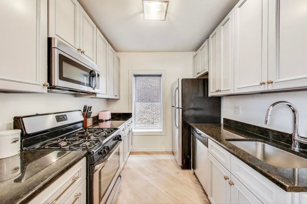 Sun-filled 2 bedroom, 2 bathroom corner condo in a charming courtyard building in Albany Park/North Park. This updated home features a spacious open-concept living and dining area with oversized windows that flood the space with natural light. The modern kitchen boasts brand-new cabinet doors and drawer fronts (2025), granite countertops, new stainless steel appliances, a breakfast bar, and a new garbage disposal (2024). Custom millwork, hardwood floors throughout, and stylish lighting fixtures add to the home's appeal. The primary suite includes a remodeled bathroom (2025) with sleek modern finishes, while the second full bath is equally updated. Additional highlights include a 2024 LG washer and dryer in-unit and extra storage. Located in a well-maintained building with green space for residents, this home also offers easy street parking and rental options nearby. Just steps to dining, shops, and parks along Kedzie and Foster, with the Kedzie Brown Line only a short walk away. Welcome home!