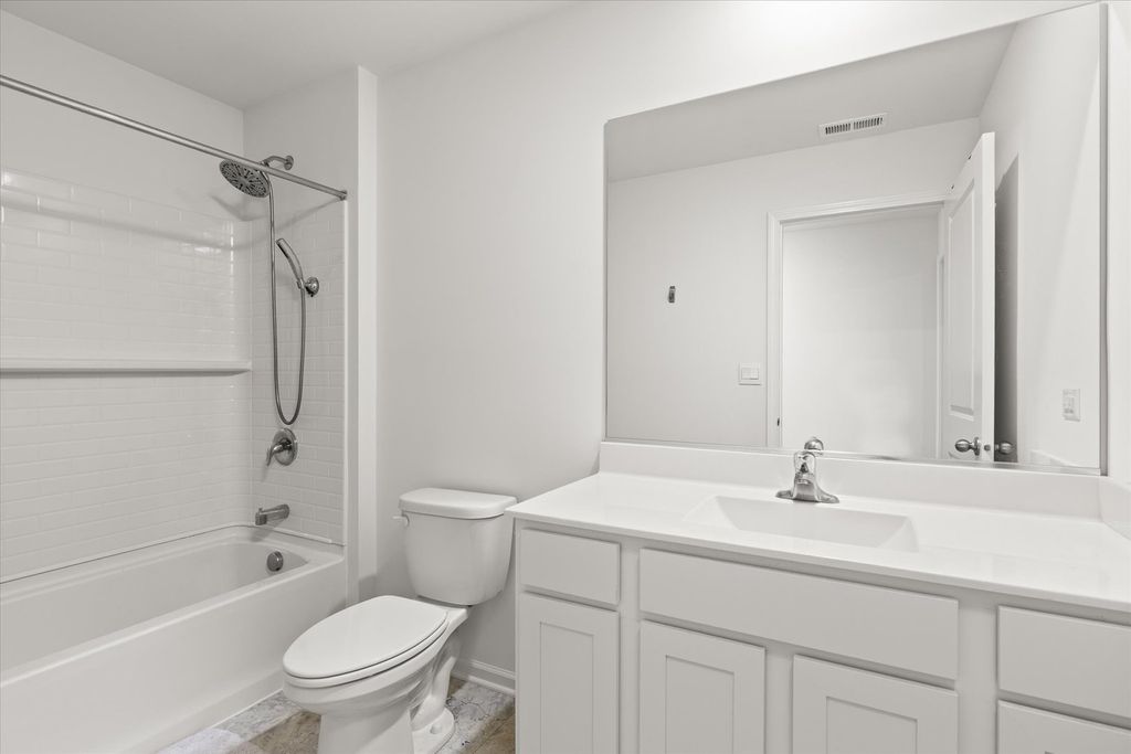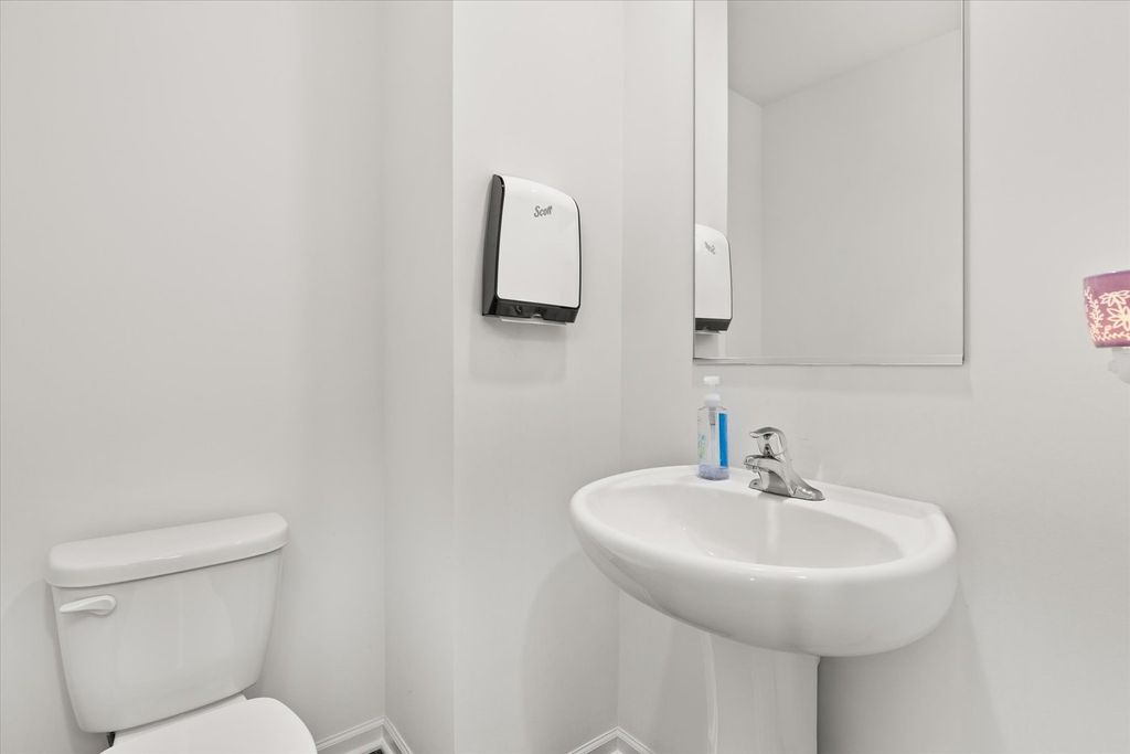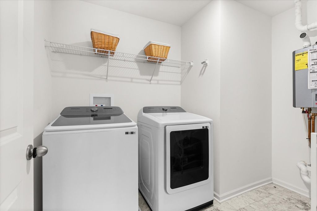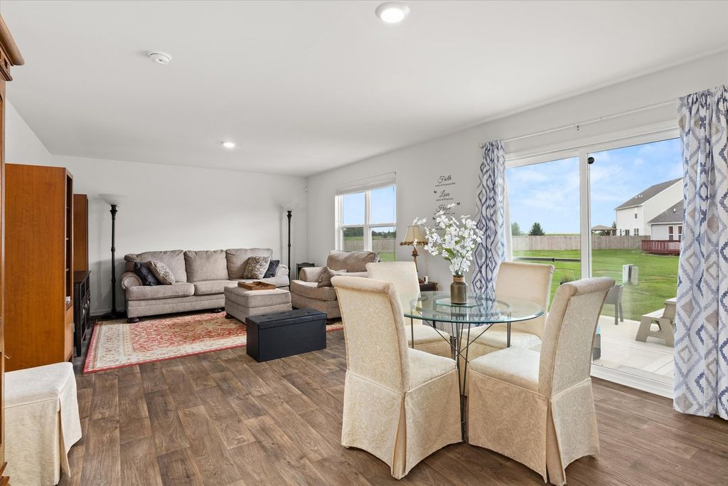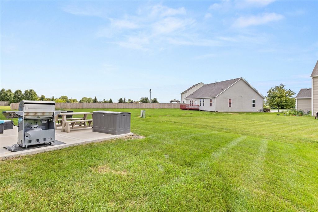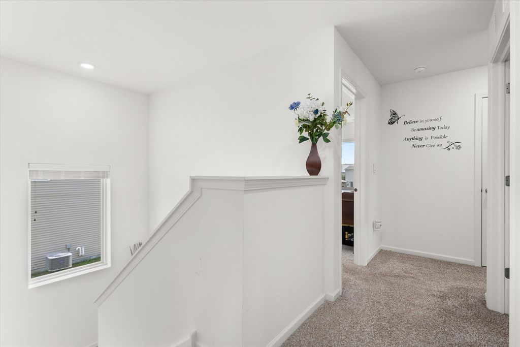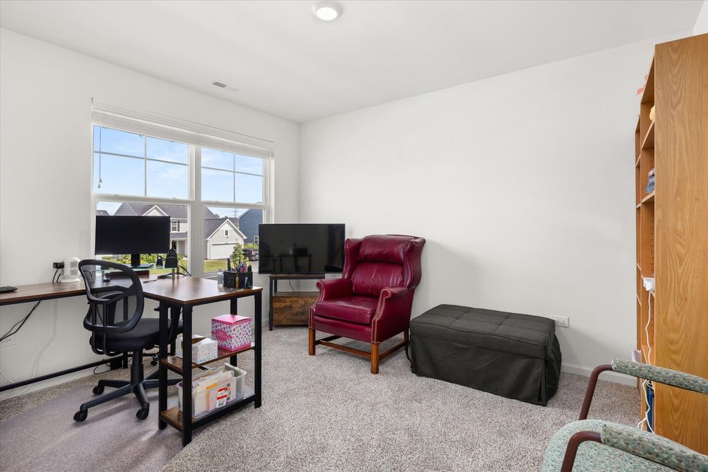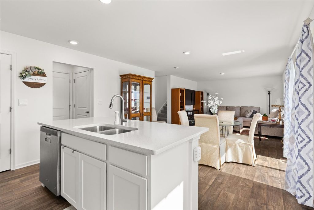 Welcome to beautiful Legacy Pointe! Why wait for new construction when this stunning two-story home, built in 2022, is ready for you now? Offering 4 bedrooms, 2.5 bathrooms, a 2-car garage, and a full unfinished basement, this home has been thoughtfully designed with both style and function in mind. A versatile study, currently being used as a dining room, greets you upon entry. The hallway then opens into a spacious living room, dining area, and an impressive kitchen featuring a large island with seating for up to four, designer white cabinetry, quartz countertops, and an oversized walk-in pantry. Upstairs, the primary suite boasts a private bath with a cultured-marble raised double-bowl vanity, walk-in shower, and separate water closet. Additional features include a tankless water heater, custom blinds throughout, and Smart HomeSM Technology for added convenience. Enjoy outdoor living with a 16x16 concrete patio and electric lighted awning in the backyard. The full basement has five added outlets for easy finishing, while the roof and HVAC come with transferable warranties for peace of mind.