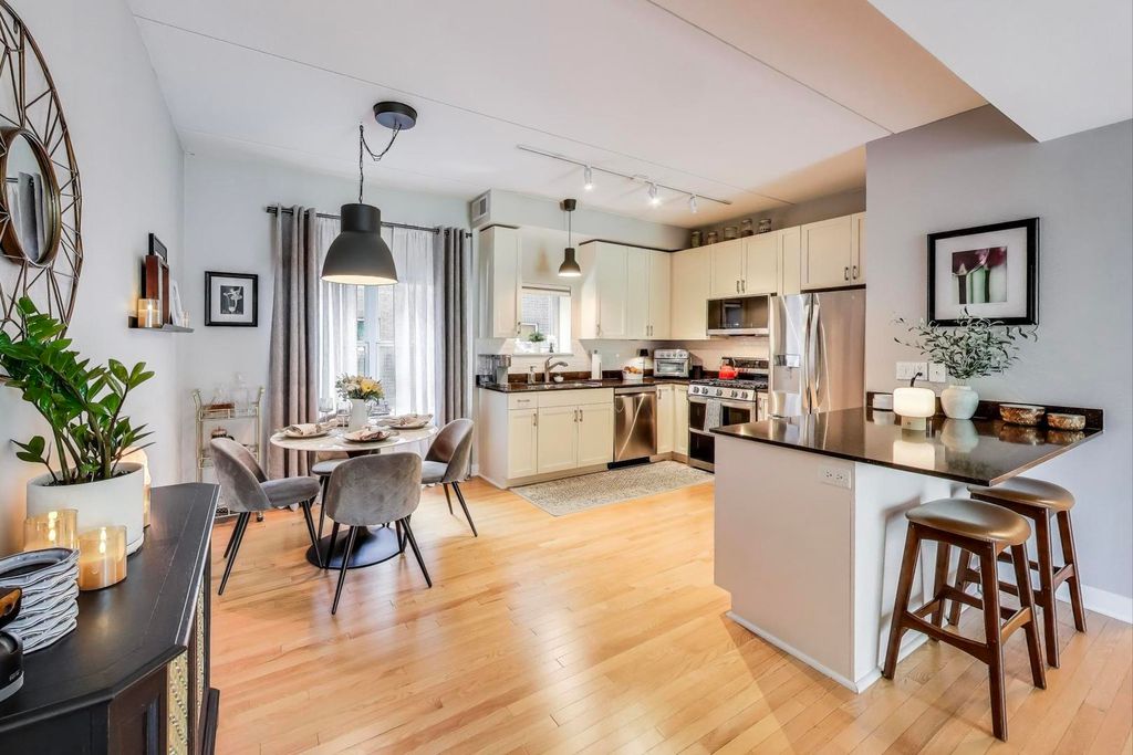 WELCOME HOME to this stunning two-bedroom, two-bath residence in the heart of Buena Park. This sophisticated home showcases a sun-drenched open floor plan with soaring nine-foot ceilings, rich hardwood flooring, and an updated kitchen seamlessly flowing into the gracious dining area and inviting living space. Step onto your private, west-facing balcony-an ideal setting for entertaining, unwinding with a book, or simply enjoying the sunset. Heated garage parking is included, as well as the convenience of an in-unit washer and dryer. Designed with comfort and functionality in mind, this home offers exceptional storage: a large in-unit storage closet, generously sized bedroom closets (including a walk-in closet in the primary suite), and additional secured storage in the building. The serene primary suite features a spa-inspired ensuite bath with a dual vanity, while a spacious second bedroom and full bath complete the thoughtful layout. With only two residences per floor, privacy and tranquility are assured. This home has been updated with premium appliances, including an LG Smart Wi-Fi oven (2025), LG Smart Wi-Fi microwave (2025), LG Smart Wi-Fi refrigerator (2023), and LG Smart Wi-Fi dishwasher (2022). Essential mechanicals have also been replaced, including a new Carrier furnace and central air system (2022). Additional enhancements include new bedroom carpeting with LifeGuard Spill Proof technology, fresh paint, and modern lighting throughout. Perfectly situated, this residence places you moments from shopping (Target, ACE Hardware, Ross, Jewel, Aldi), dining destinations (Michael's, Bar on Buena, Reservoir, North Buena Deli), multiple transit options (Sheridan 151 bus, Broadway 36 bus, Sheridan and Wilson Red Lines), and the lakefront path. Experience the perfect blend of elegance, comfort, and convenience in this exceptional Buena Park home.