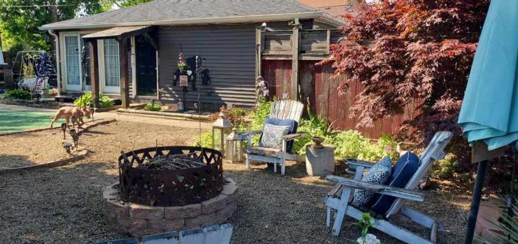 Welcome to this private retreat where nature and comfort blend seamlessly. The property features a stunning flower garden with cherry blossoms, peonies, lilies, hostas, hydrangeas, and more. A tranquil pond and mature landscaping create a true sanctuary, attracting birds year-round. Inside, the first floor offers an open kitchen, cozy napping nook, music/media room, and separate dining area that doubles as a coffee lounge. Recent updates include newer appliances, roof, washer, and dryer. Upstairs, a spacious loft bedroom with full bath. The large yard includes a covered deck, play area, fire pit, greenhouse for fresh herbs, and a versatile outbuilding ideal for yoga or creative work. A private guest house is tucked away in back. Much larger than it appears. Perfect for multigenerational living or in-law setup. Room to expand on oversized lot.