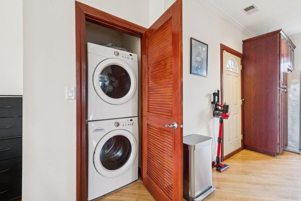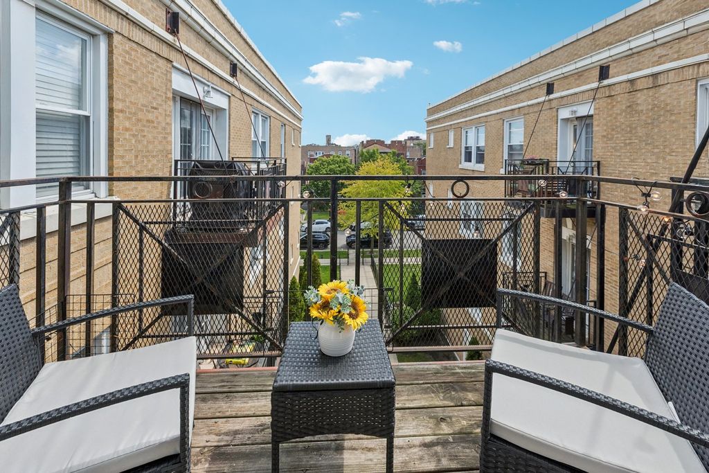 Beautiful Top-Floor Condo in Prime Albany Park Location. Bright and spacious 2BR/1BA condo situated in a charming brick courtyard building. This sun-filled home features hardwood floors throughout and an inviting open living and dining area with crown molding that leads to a large balcony overlooking the lush, landscaped courtyard-perfect for morning coffee or evening relaxation. The updated kitchen is equipped with newer stainless steel appliances (refrigerator 2024), cherry cabinetry, and granite countertops. Two generously sized bedrooms, a full bath with a whirlpool tub, and convenient in-unit laundry complete the unit. Additional storage is available in the basement. Ideally located just a short walk to the Brown Line and multiple CTA stops, with easy access to shopping, parks, and a wide variety of restaurants. Easy street parking makes city living a breeze.