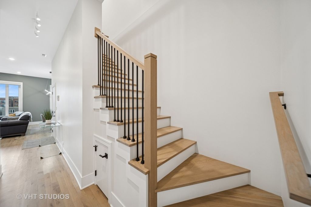 Penthouse Living in the Heart of Bronzeville. Newer construction 3-bedroom, 2-bath penthouse condominium in highly sought after Bronzeville blends sophisticated style, modern comfort, and an expansive private rooftop deck-perfect for entertaining or relaxing with unobstructed panoramic views of the city skyline. Step inside your top-floor condominium to find 11-foot ceilings, oak hardwood flooring, LED and pendant lighting, matte black hardware and rays of natural light pouring through sleek encasement windows. The open-concept layout seamlessly connects the spacious living area (large enough for a cozy sectional), dining space (ample room for an 8-person table), making it ideal for functional everyday living and hosting guests. The kitchen impresses with white quartz counters with breakfast bar for four, stainless-steel appliance suite with hidden exhaust, designer large format porcelain tile backsplash, dual toned flat panel cabinets with modern finger pulls and accented by under-cabinet lighting. Retreat to the primary bedroom, where you'll find a generously sized bedroom that fits a king-sized bed, a walk-in closet with french doors and custom closet organizers, and a spa-like ensuite bathroom with double vanity, a walk-in shower with a traditional and rainfall showerhead, handheld wand, bench, elegant porcelain tile and glass enclosure. There are two additional bedrooms and a second bath. Additional features include a rear balcony, private garage parking, full wiring for security, internet, and cable, as well as upgraded sound insulation between floors-perfect for peace and productivity while working from home. Located just steps from Chicago's beautiful lakefront and Hyde Park's bustling 53rd Street corridor and local favorites: Sip & Savor, Two Fish Crab Shack, Simply Soups & Salads, as well as cafes, galleries, shopping, the Green Line, and Washington Park. Bronzeville - where culture, cuisine, and community meet.