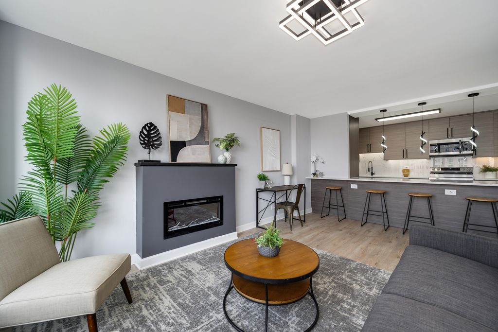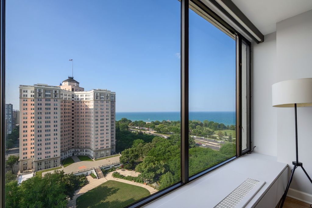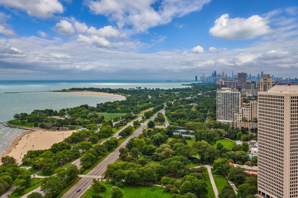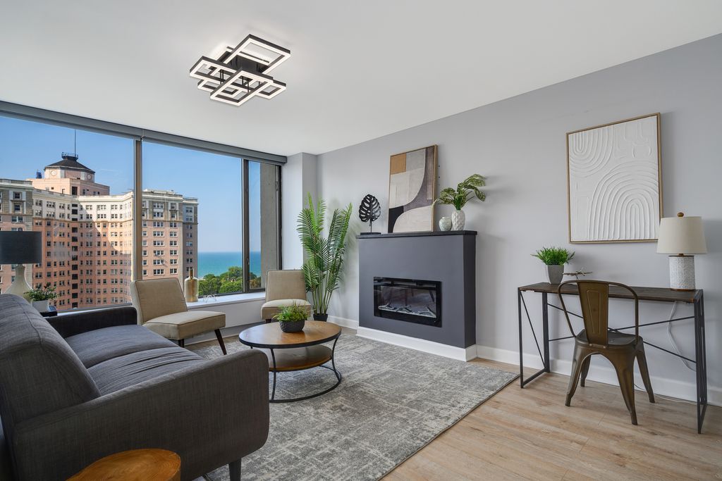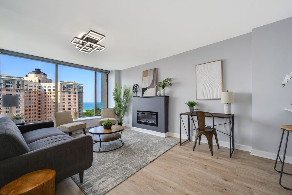 Enjoy breathtaking views of Lake Michigan from every room in this beautifully renovated 2-bedroom condo, updated from top to bottom in 2023 and gently lived in by just one owner since then. Every inch of this home was thoughtfully designed to combine modern comfort with sleek, contemporary style. The open layout centers around a stunning kitchen featuring two-tone, soft-close cabinets, quartz countertops, and an oversized breakfast bar with integrated extras: a wine cooler, USB-A & -C charging ports, and a wireless phone charger. Samsung stainless steel appliances, including a French-door fridge and dishwasher, elevate the space. The living room flows effortlessly from the kitchen and offers a built-in fireplace, perfect for cozy nights during the Chicago winter. Custom Hunter Douglas motorized screen shades (3% in living room and spare bedroom/office; 0% in master bedroom). Water-resistant flooring and dimmable LED ceiling lights run throughout the entire home. Both bedrooms offer generous closet space with custom organizers and built-in sensor lighting. The bathroom is truly spa-inspired, with a double vanity, walk-in shower with black hex tile, matte black finishes, and a smart LED mirror that resists fog, dims to your liking, plays music, and displays time and temp. A heated towel rack completes the space with a touch of luxury. The building offers resort-style amenities: a rooftop sun deck, swimming pool, tennis courts, two party rooms, 24-hour door staff, and newly renovated elevators. Located steps from the beach, public transit, shopping, parks, Mariano's and Jewel Osco - you'll have everything you need right outside your door. This is a pet-friendly, investor-friendly building with no rental restrictions. Parking is immediately available. Monthly assessments include water, central heat/AC, cable, internet, and more!